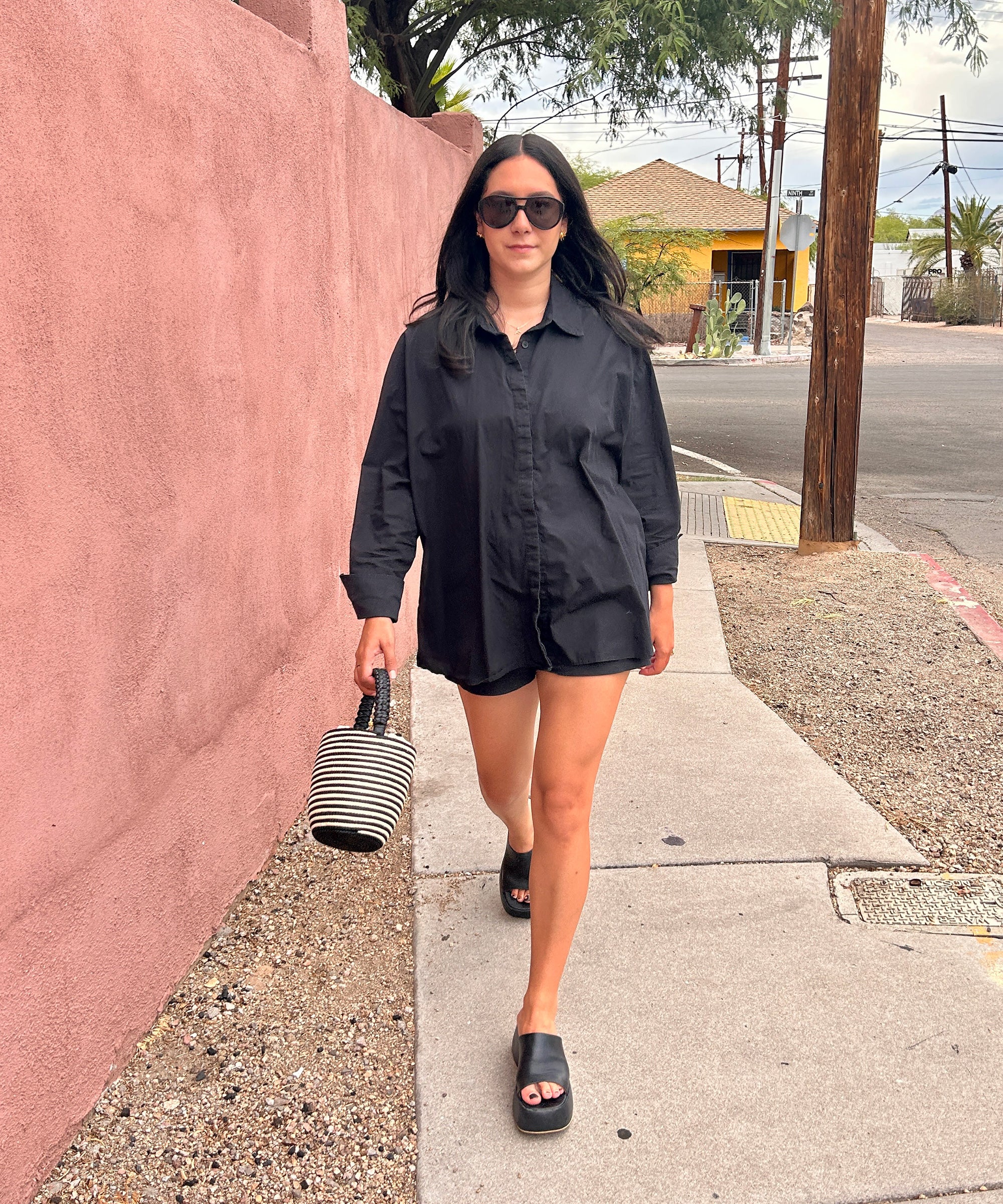 There are not many opportunities to take a summertime walk in Arizona, but locations like the Tucson Botanical Gardens offer a nice combination of sun and shade with beautiful nature. For this outing, I wore an oversized shirt with rolled-up sleeves While a button-down may seem counterintuitive in the summer, the loose silhouette actually helps the body stay cool in the dry heat. To keep it from looking too business casual, I paired the look with cotton shorts, a wide-brim hat, a raffia bag, and gladiator-style Teva sandals.