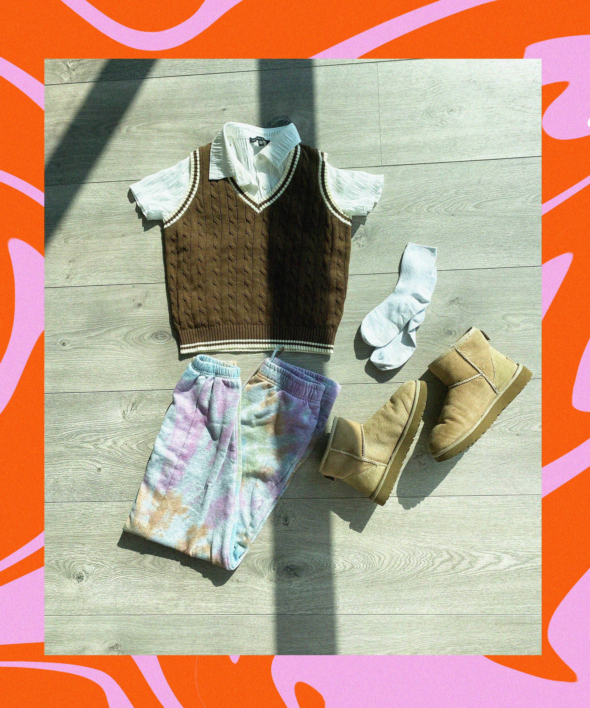 When that time does arrive, and Chamberlain is forced to finally confront her lockdown purchases, there are a few things she won’t be adding to the donation pile. In addition to the aforementioned Pacsun sweat shorts and red fleece jacket, she says she depends on cropped, graphic tees and soft cardigans. And of course, there are yoga pants, the ‘00s trend that Chamberlain is known for spearheading on TikTok and isn’t ready to give up. Her defense? “It’s almost like a corny mom going to play tennis with her friends [look], but make it a little hot,” she explains, adding that they remind her of Princess Diana’s signature crewneck-bike shorts ensemble. “I saw those photos and was like, I kind of want to do that, but with yoga pants, because, why not? I like yoga pants.”