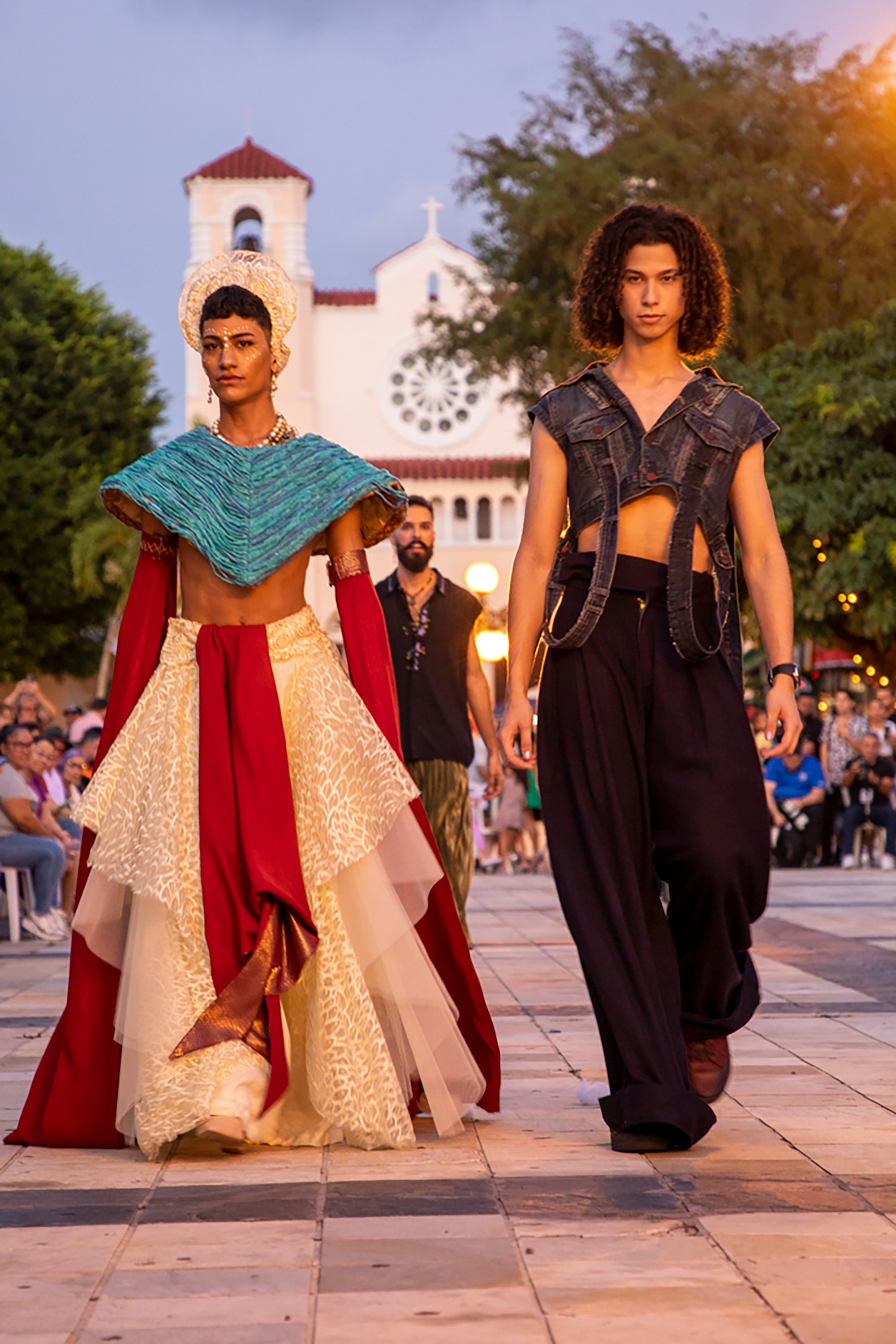 As the sun waved goodbye in Caguas, I saw upcycled pieces styled in an androgynous aesthetic, from designer Crystal Vélez’s brand Crystla. Lechat Costumier, designed by Daniela Fabrizi, showcased genderless and modular pants with peeking boxers, paired with feather tops and tiny bikinis. Bon Múdez presented a collection that commented on cultural appropriation and colonialism in Puerto Rico’s history that ended with a top-and-skirt combo that resembled the island’s flag.