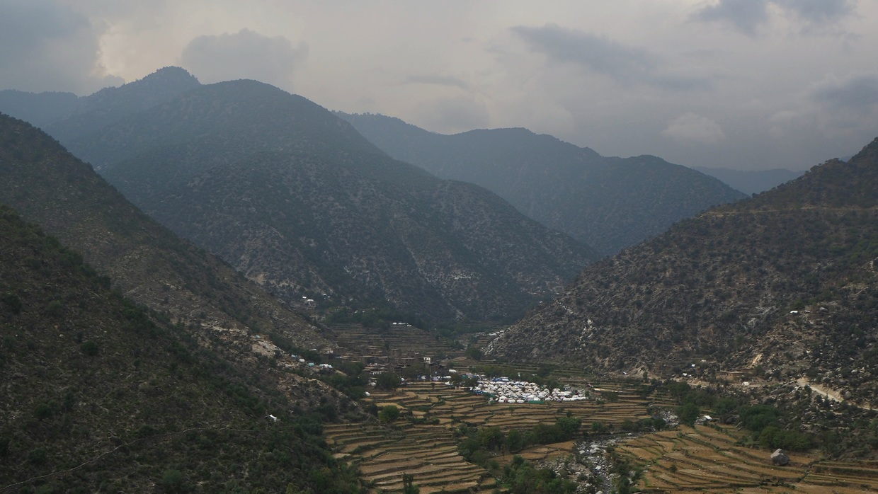 From above, from the mountainside, the village appears serene. But on the other side of the valley, ruined houses mar the pastoral idyll.