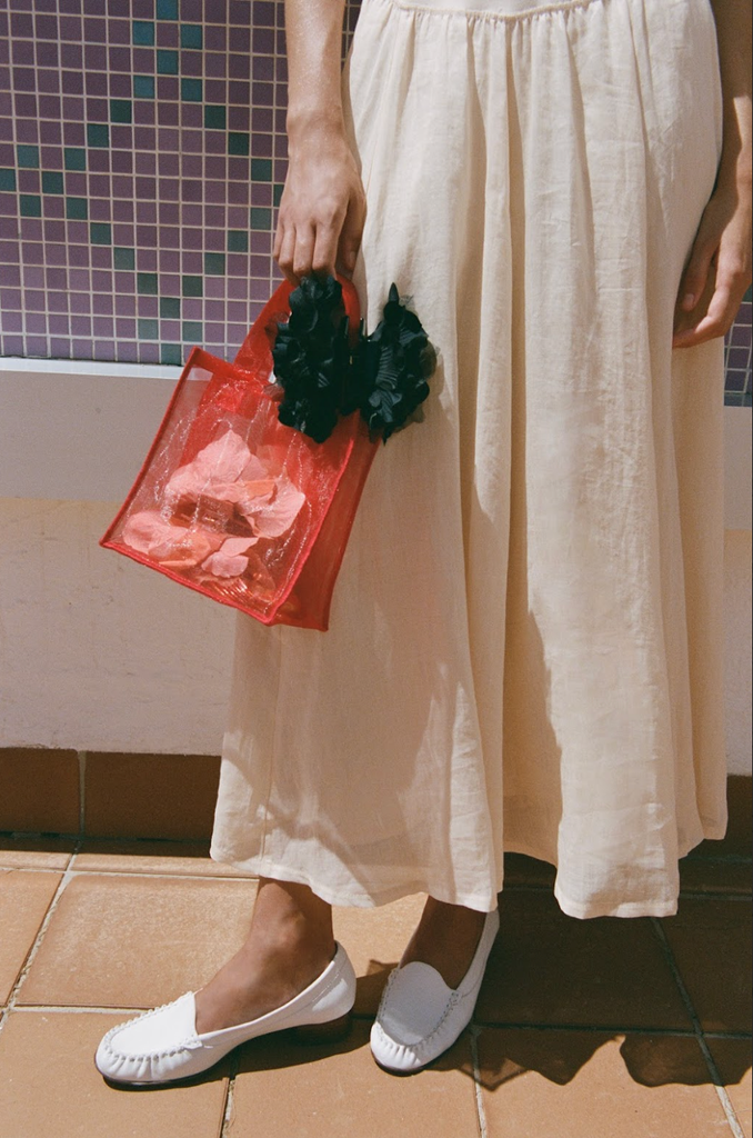 In check with Nassir Zadeh’s love of accessorizing, this collection features its fair share of summer accessories — and they’re anything but average. Grab hold of a mini tote bag in a colorful sheer mesh, slip on a trendy rosette hair clip or large floral scrunchie, and step into heeled loafers for a head-to-toe designer look.