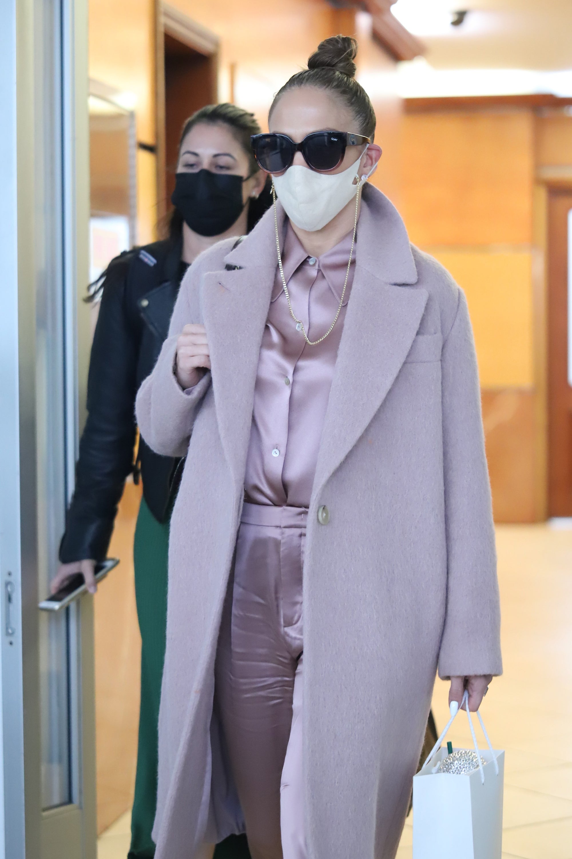 On Wednesday, Jennifer Lopez was seen in Beverly Hills wearing the ultimate pandemic-era look: a silk, monochrome pajama-like set paired with a linen face mask adorned with a dainty gold chain. Her blush pink two-piece included a collared, button-down shirt, which she tucked into a pair of matching, wide-leg trousers. She topped off the look with white sneakers and a coordinating pink coat. But while we’ll always appreciate a luxury PJ moment from the Hustlers star, it was her face mask — to be exact, its accompanying mask chain — that stole the show.