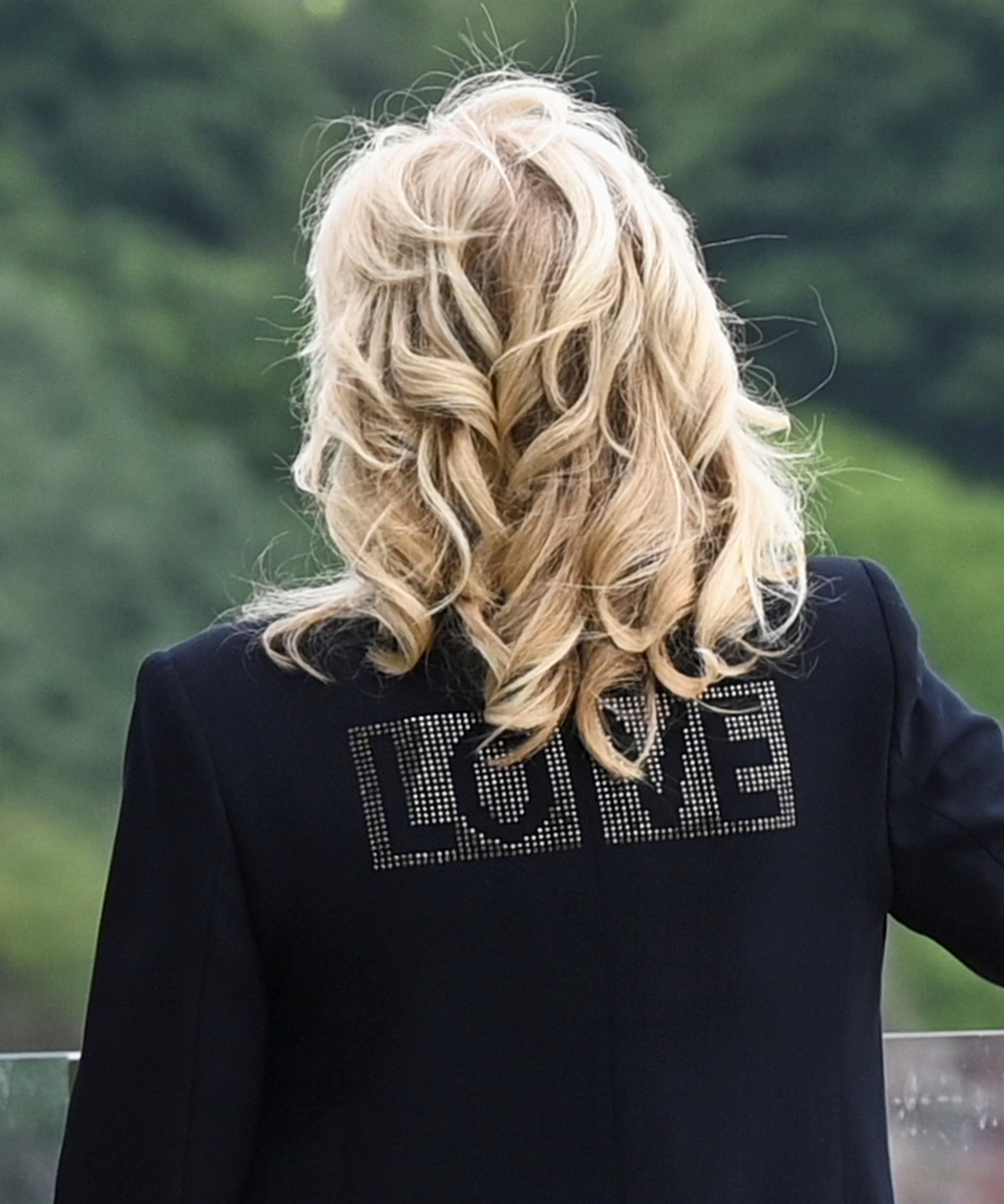 Jill Biden is sending love with her latest look. On Thursday, the First Lady met with U.K. Prime Minister Boris Johnson while wearing a black jacket with the word “Love” emblazoned with crystals on the back.