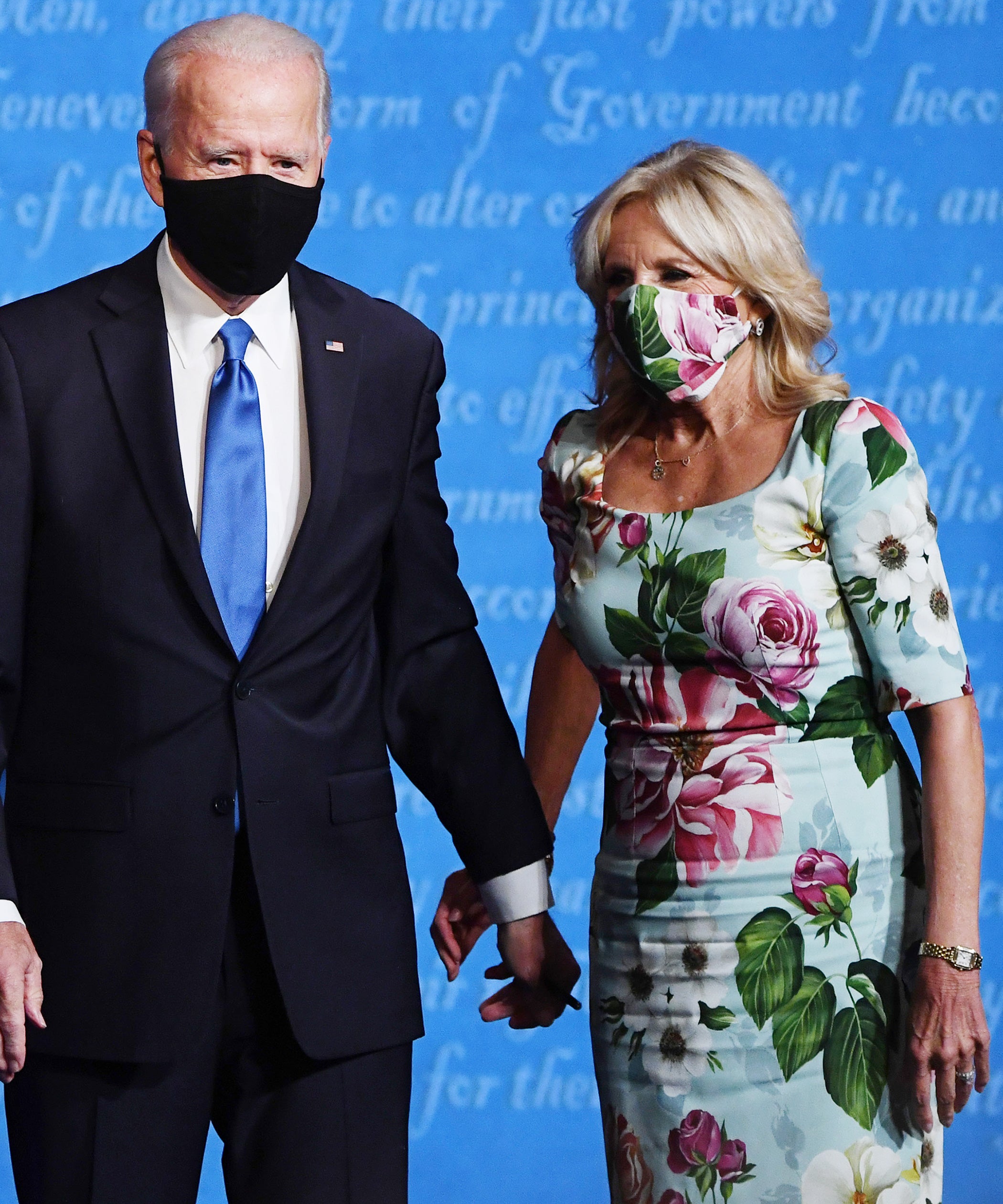 Even better than the matching dress and face mask, though, was the jovial pattern. Typically, candidates’ wives dress for the debate in monochrome ensembles that rarely stand out. Of course, there was Mrs. Trump’s 2016 Gucci pussy bow blouse, which caused quite the stir following the infamous Access Hollywood tape, at the second presidential debate. Still, even then, she paired the shirt with matching pink trousers. Rarely does the First Lady or the potential next First Lady stray from the tonal uniform, making Dr. Biden’s vibrant floral print look especially welcome on stage. (For the first presidential debate, Dr. Biden wore a green, satin dress by NY-based sustainable designer Gabriela Hearst.)