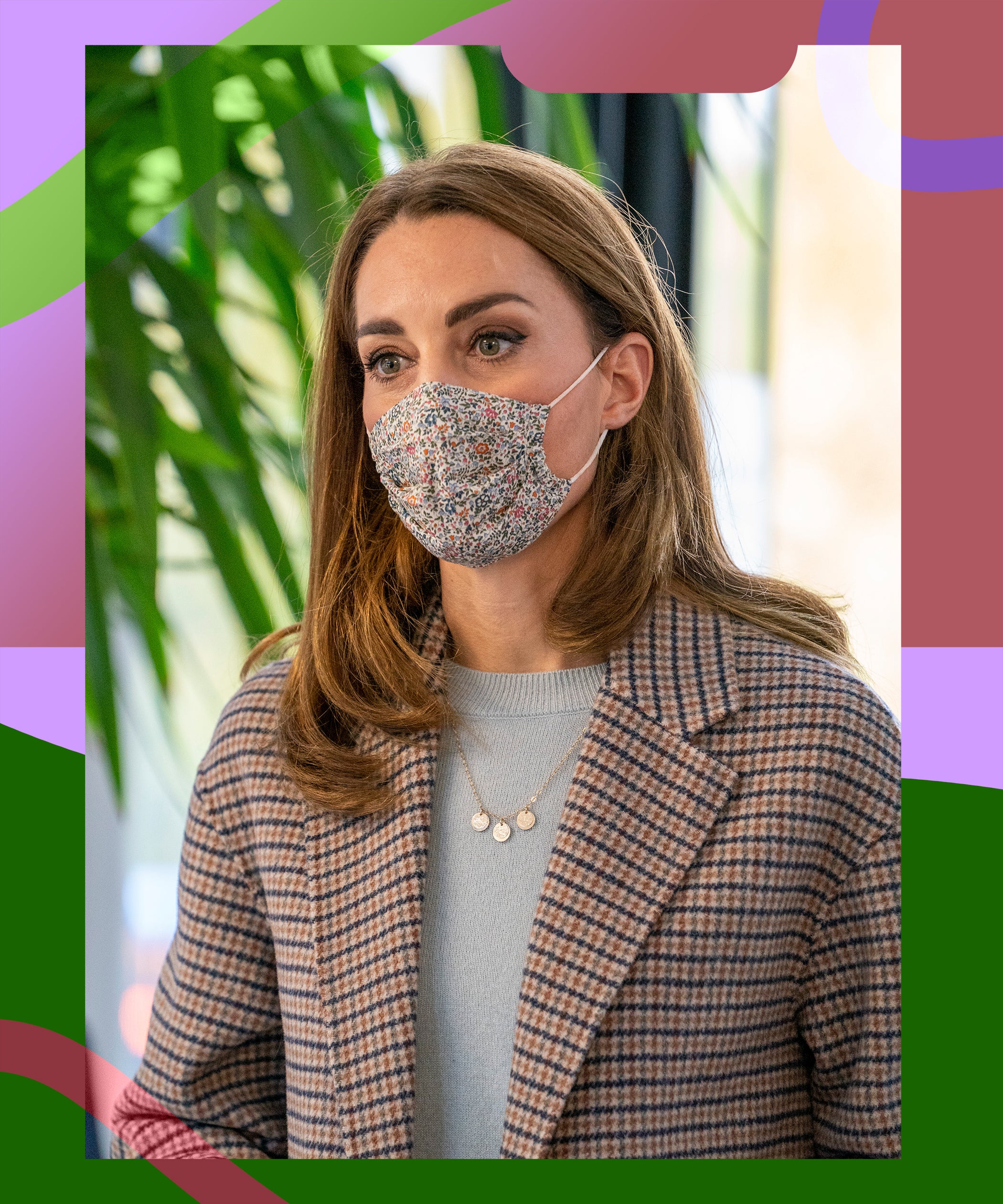 On Tuesday, during a trip to the University of Derby in England, the Duchess of Cambridge not only re-wore her favorite floral face mask, but she paired it with another print in the form of a plaid coat. There to speak with students about how the pandemic has affected their university experience, as well as their mental health, Middleton went full prep, pairing her fall-appropriate checkered outerwear with a sky blue cashmere sweater, both courtesy of Zara’s luxury sister brand Massimo Dutti, high-waisted black trousers, and a pair of chunky heel pumps. She even carried around a University of Derby tote bag in order to, you know, fit right in.