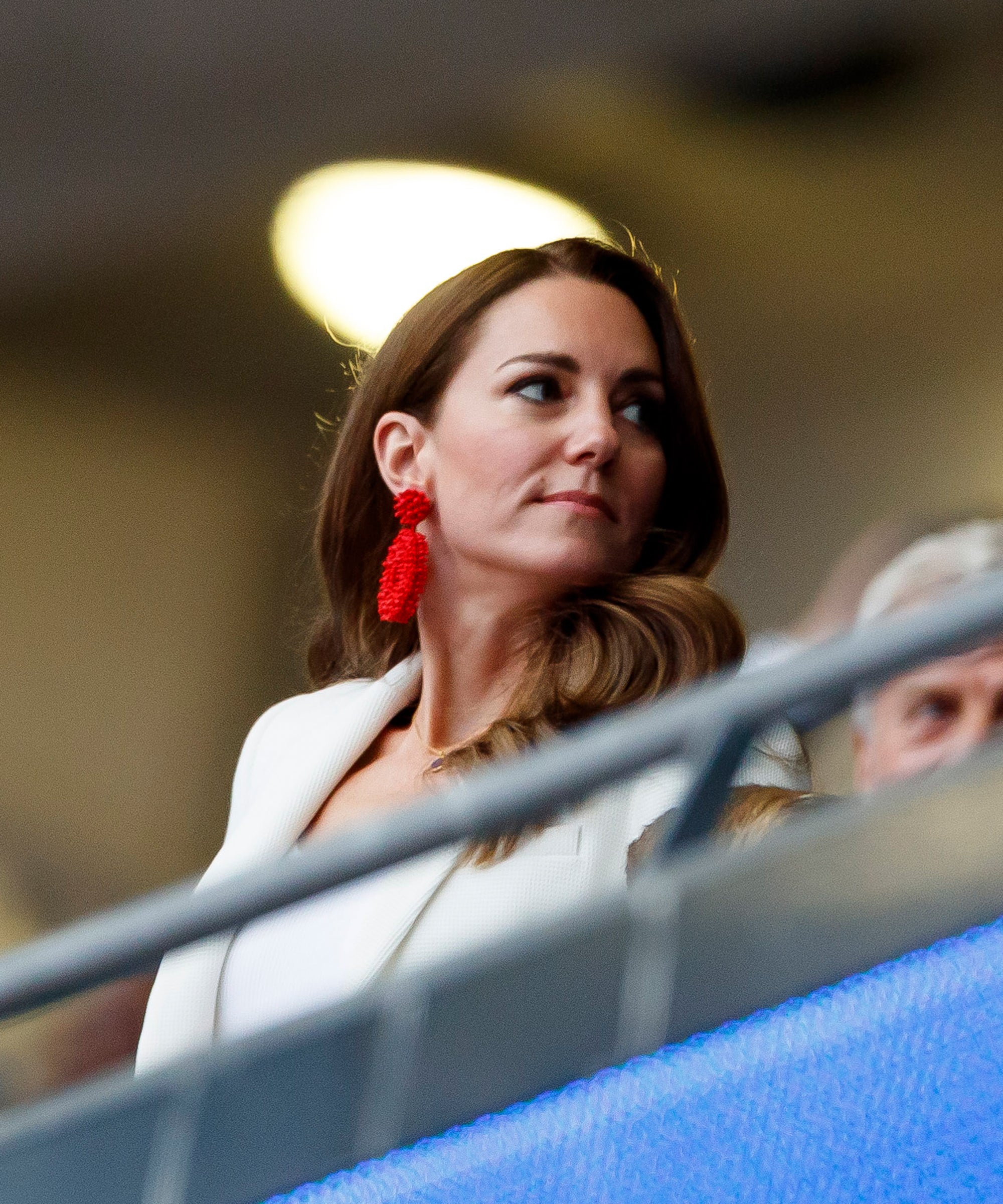 On Sunday, Middleton accompanied her husband, the Duke of Cambridge, to the 2020 UEFA European Football Championship final, between England and Italy, donning a white blazer and black slacks. She accessorized with red beaded earrings, adding a bold touch to the otherwise-casual look. The statement earrings, from London-based retailer Blaiz, are not only still available but they are also fairly affordable (at least compared to the designer looks Middleton often sports), retailing for $92.