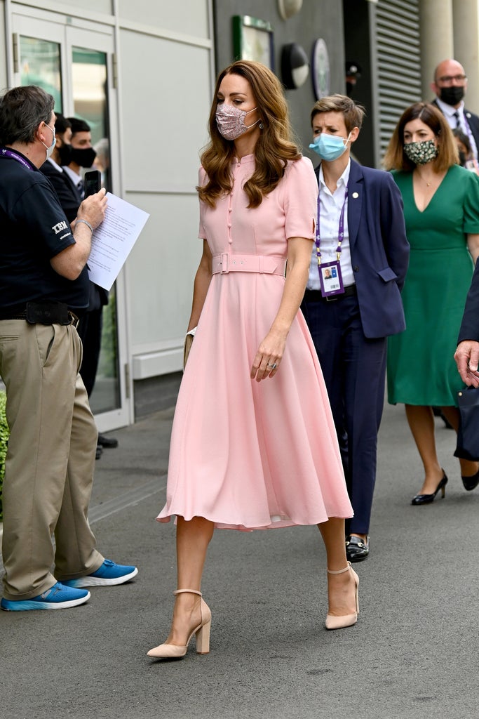 This wasn’t Middleton’s only sporting outing of the day. Earlier on Sunday, Middleton attended a Wimbledon match in a soft pink dress with a belt by London-based brand Beulah, paired with her staple floral-print mask. Pink has been favorite of Middleton as of late She donned a fuschia Alexander McQueen dress to meet First Lady Jill Biden in June.