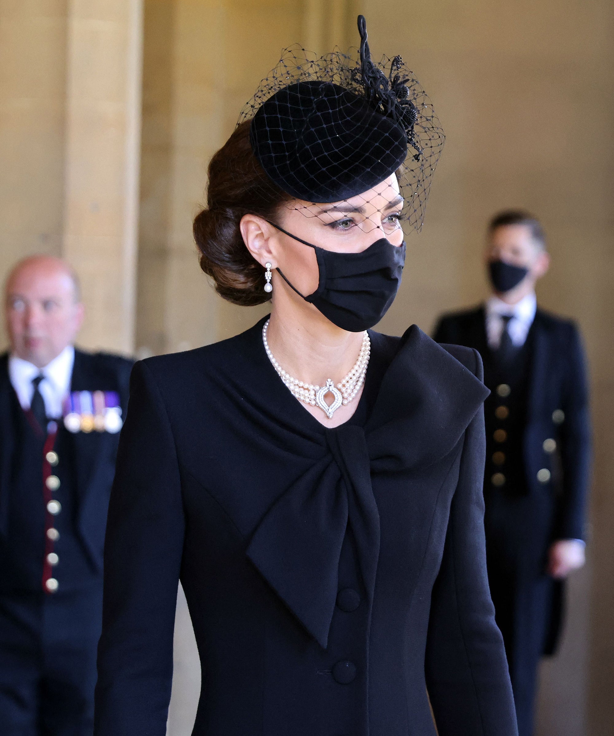 On Saturday, the Royal Family came together at St. George’s Chapel at Windsor Castle for the funeral of the Duke of Edinburgh, Prince Philip, who died on April 9. For the service, Duchess of Cambridge, Kate Middleton, wore a Roland Mouret coat dress with bow detailing on the front and an asymmetric hem and a Philip Treacy fascinator. Her jewelry included a pair of diamond-and-pearl drop earrings and a pearl necklace, both of which came from Queen Elizabeth II’s private collection. The duo is significant for more than just its tribute to Her Majesty, though. Both were previously worn by Middleton’s late mother-in-law, Princess Diana.