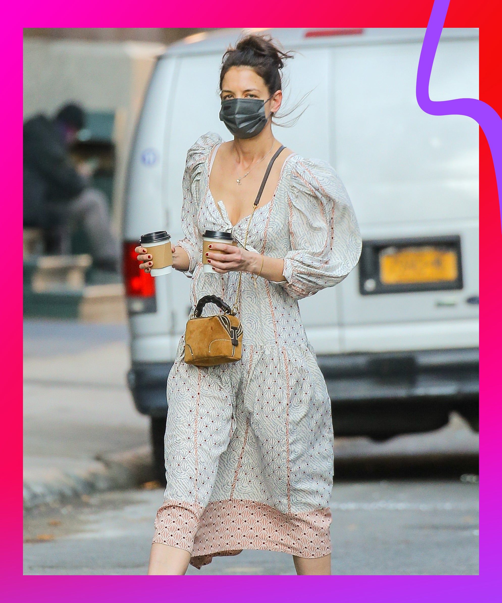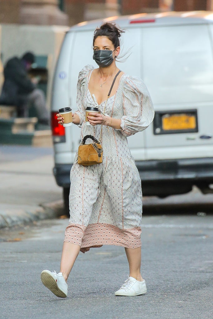 On Wednesday, during one of the first truly warm days of the year, Katie Holmes was spotted on a coffee run in New York City, taking advantage of the rising temperatures. Though it was technically more light-jacket than no-jacket weather — the temperature tapped out at 54 degrees — Holmes ditched protocol, breaking out her best spring dress-sneaker combination to kick-start the season.