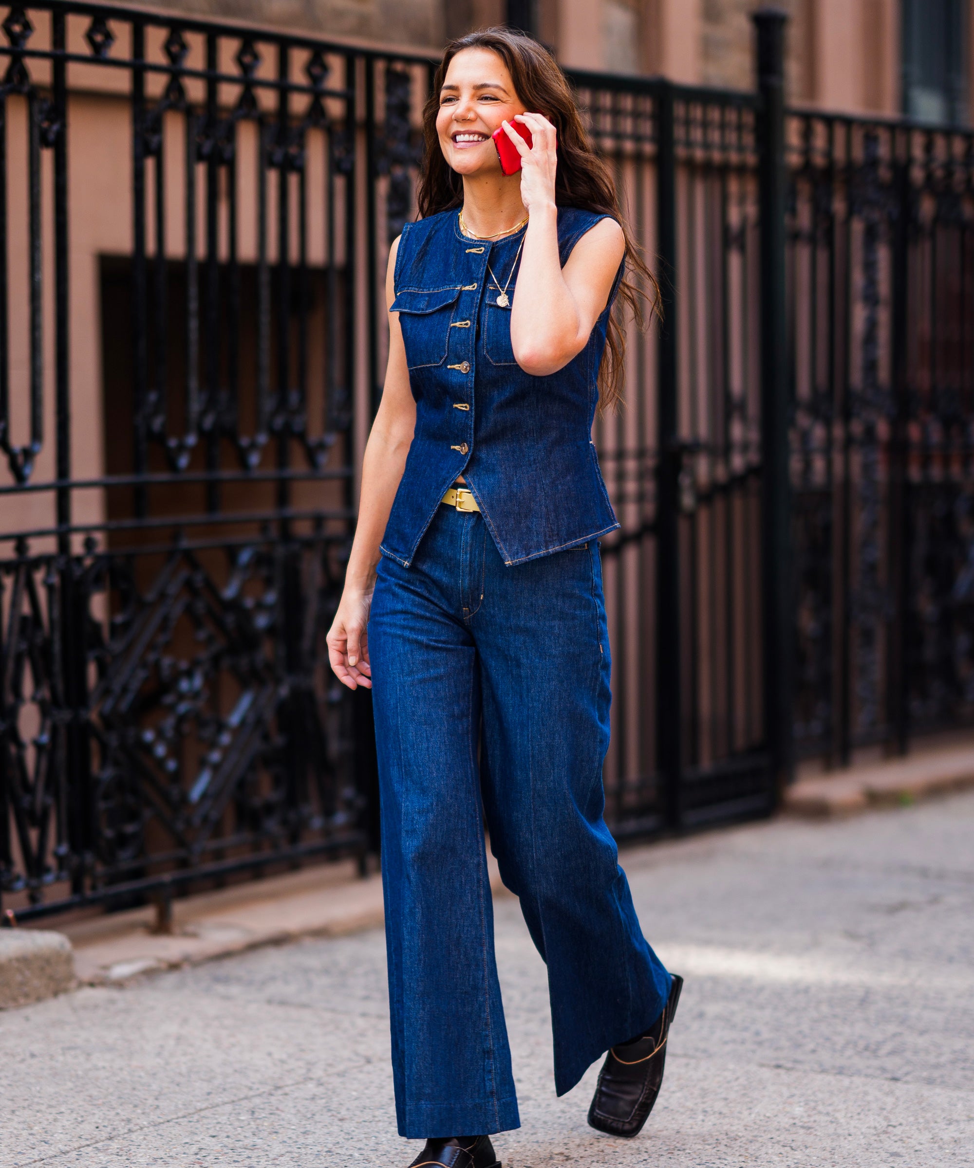 Holmes opted for a high-fashion Canadian tuxedo, donning a unique denim vest and wide-leg jean, which she accessorized with chunky loafers. And even better, each Banana Republic style comes in under $150. Read on to find out Holmes’ exact go-to denim pieces as well as alternatives for the brand to put together your own head-to-toe denim ‘fit.