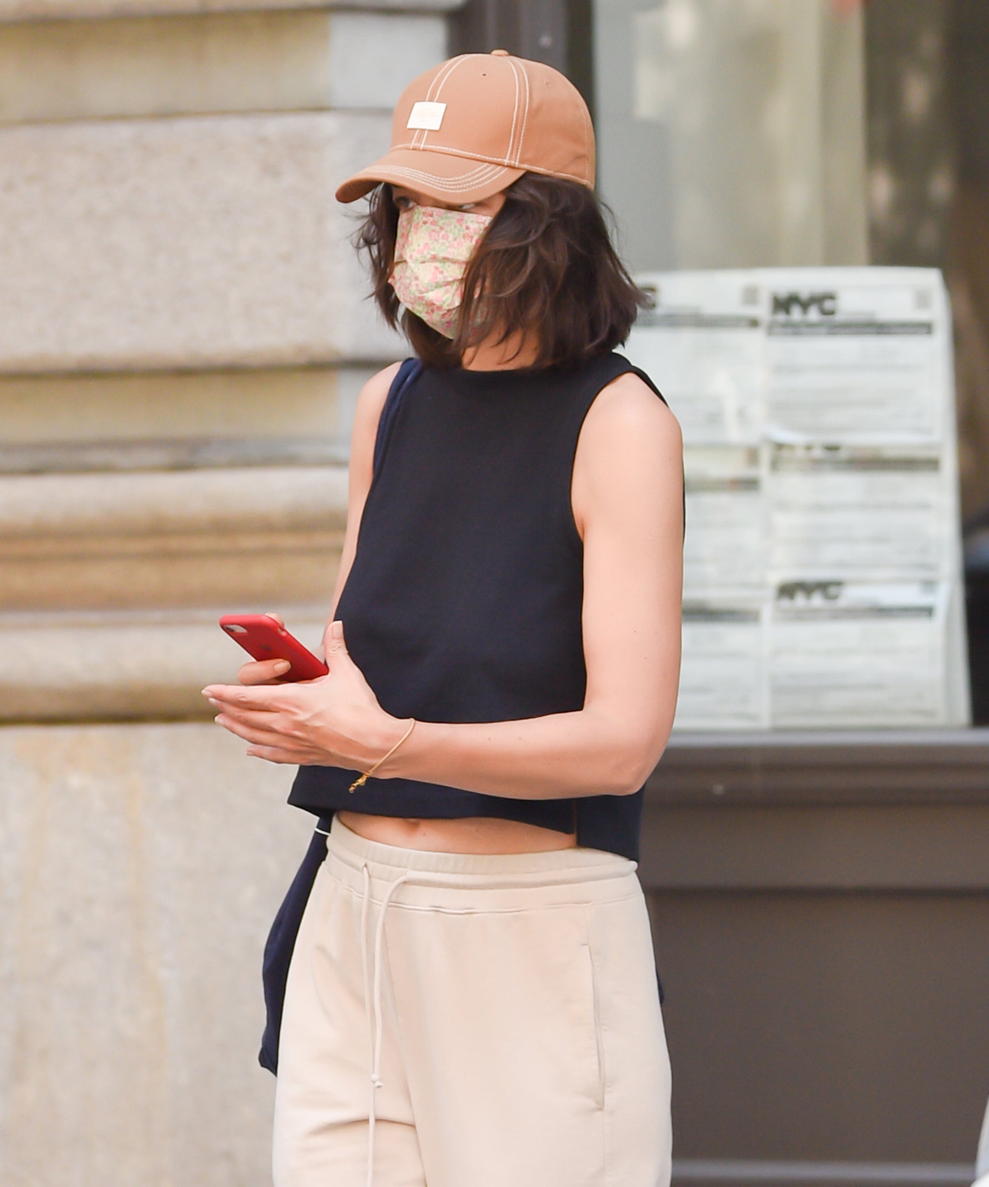 On Tuesday, Katie Holmes was spotted in SoHo looking not the least bit phased by the current heatwave in New York City. For the comfy-casual look, the Dawson’s Creek alum paired a black muscle tee with khaki-colored joggers, a matching baseball cap, and the summer shoe fashion loves to hate: Birkenstocks. Specifically: black, leather 1774 Arizona sandals with silver hardware.