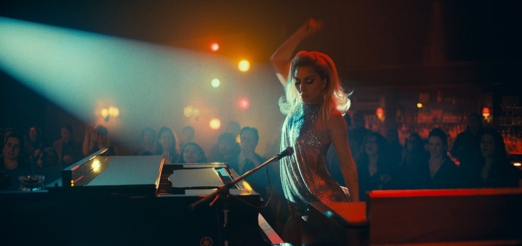 The nuptials transition into a raucous jazz performance at the ill-fated (and ominously named) Pogo’s comedy club. Lee smashes the keys on a baby grand as she belts out a banger, wearing a silver metal mesh dress that sways with her bombastic movements, bringing to mind…well, Lady Gaga.