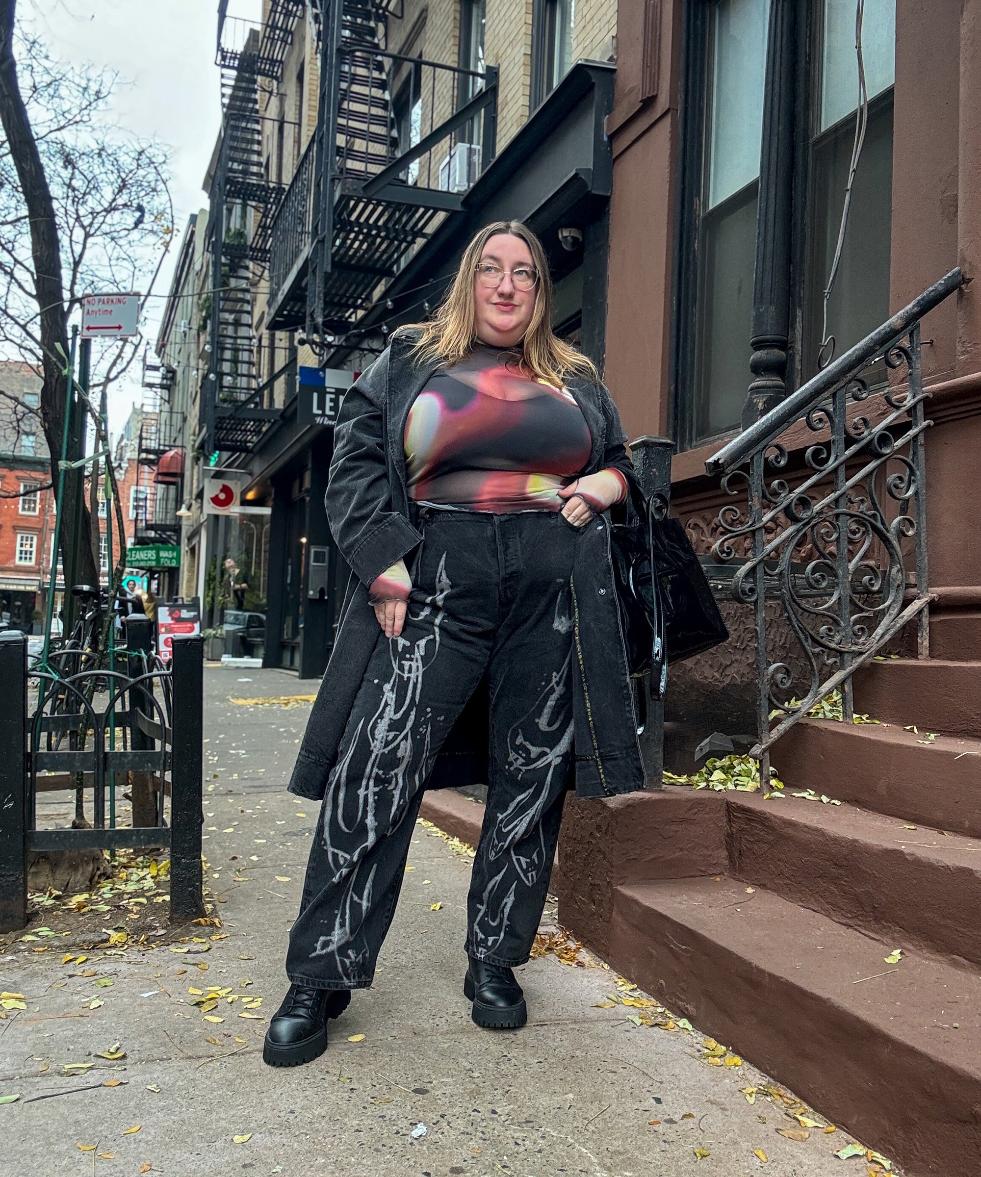 The long-line denim Dress Coat, on the other hand, is sized very generously. It is meant to be oversized, but I want to be clear: Even if you are sizing up in the other items, you do not need to do so for this one! Ferreira says that the jacket is her personal favorite from the collection: “[I]t’s perfect for anyone. It’s baggy and distressed in the best way.” Between the denim weight and the faded black denim, I have to agree. It’s like the ultimate vintage find, but in sizing that would fit up to a 4x (something all too rare with actual vintage, as any experienced plus thrifter can confirm).