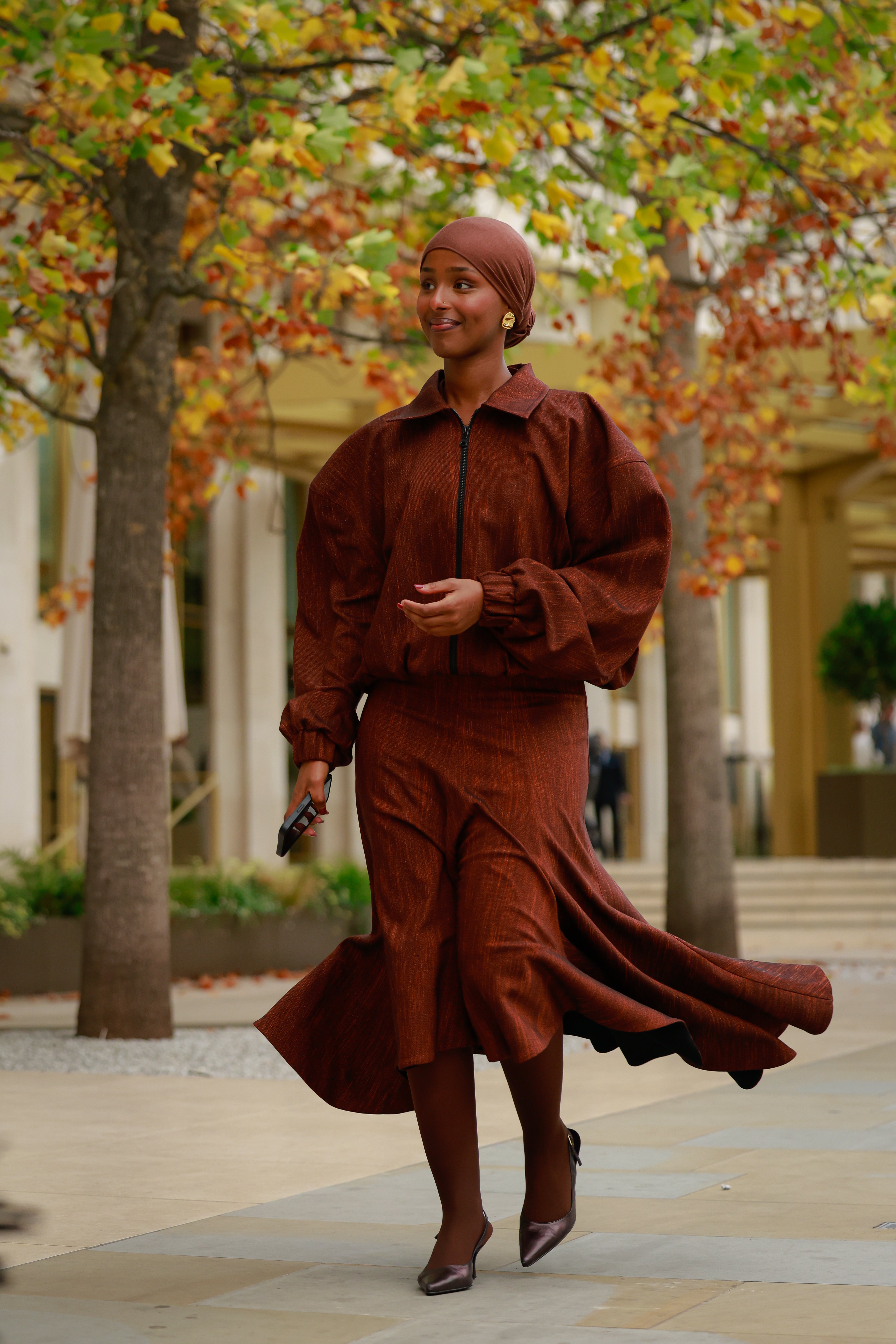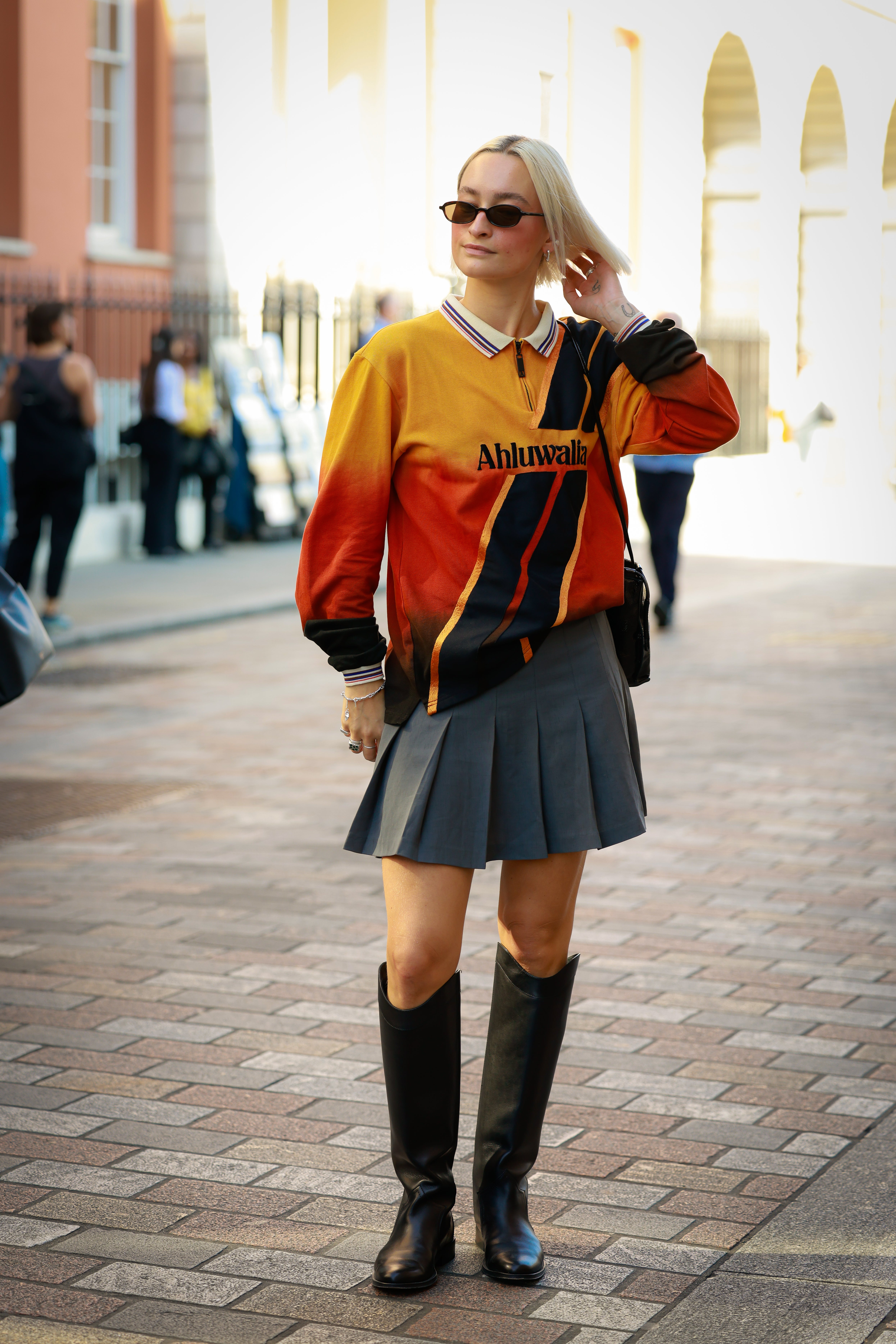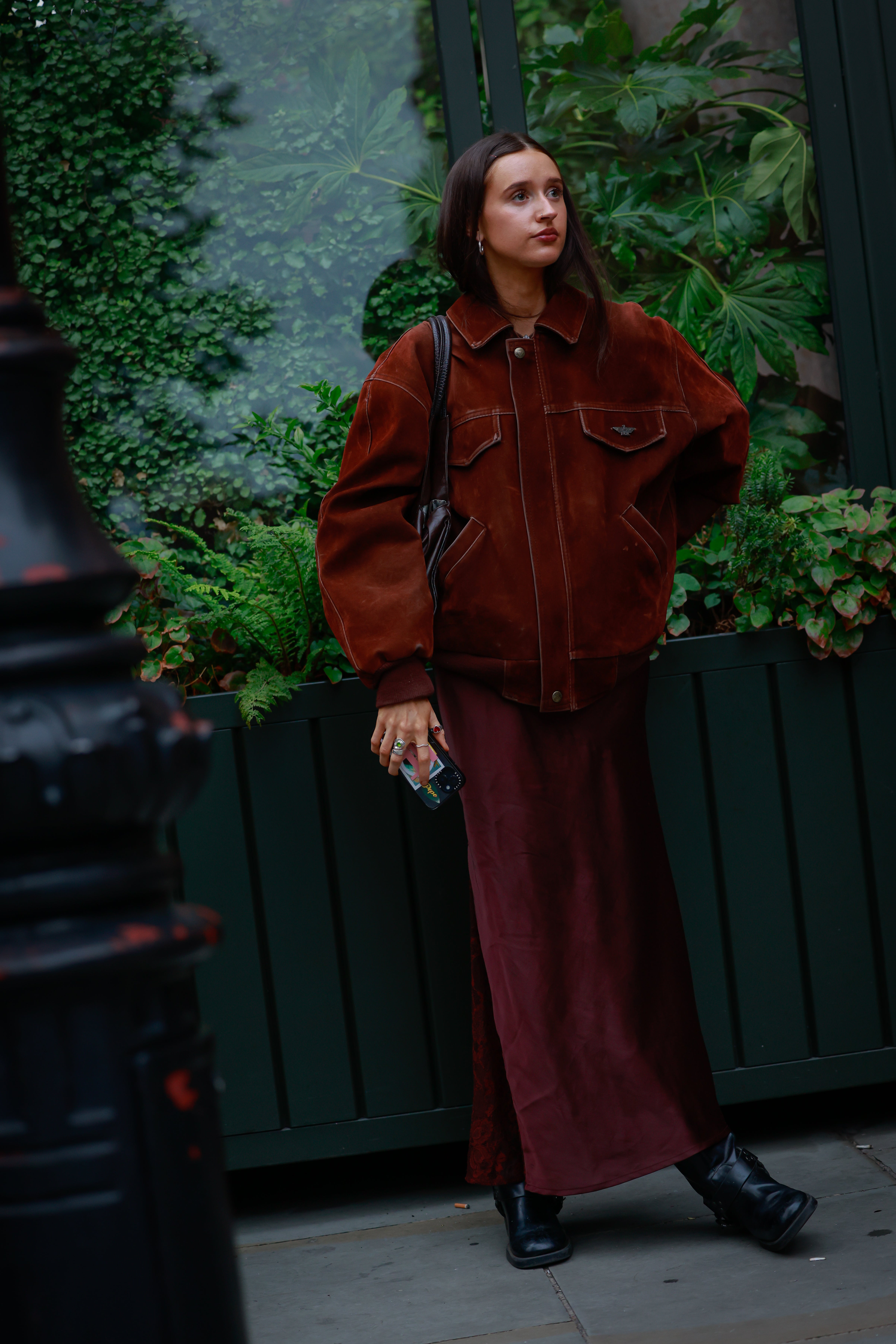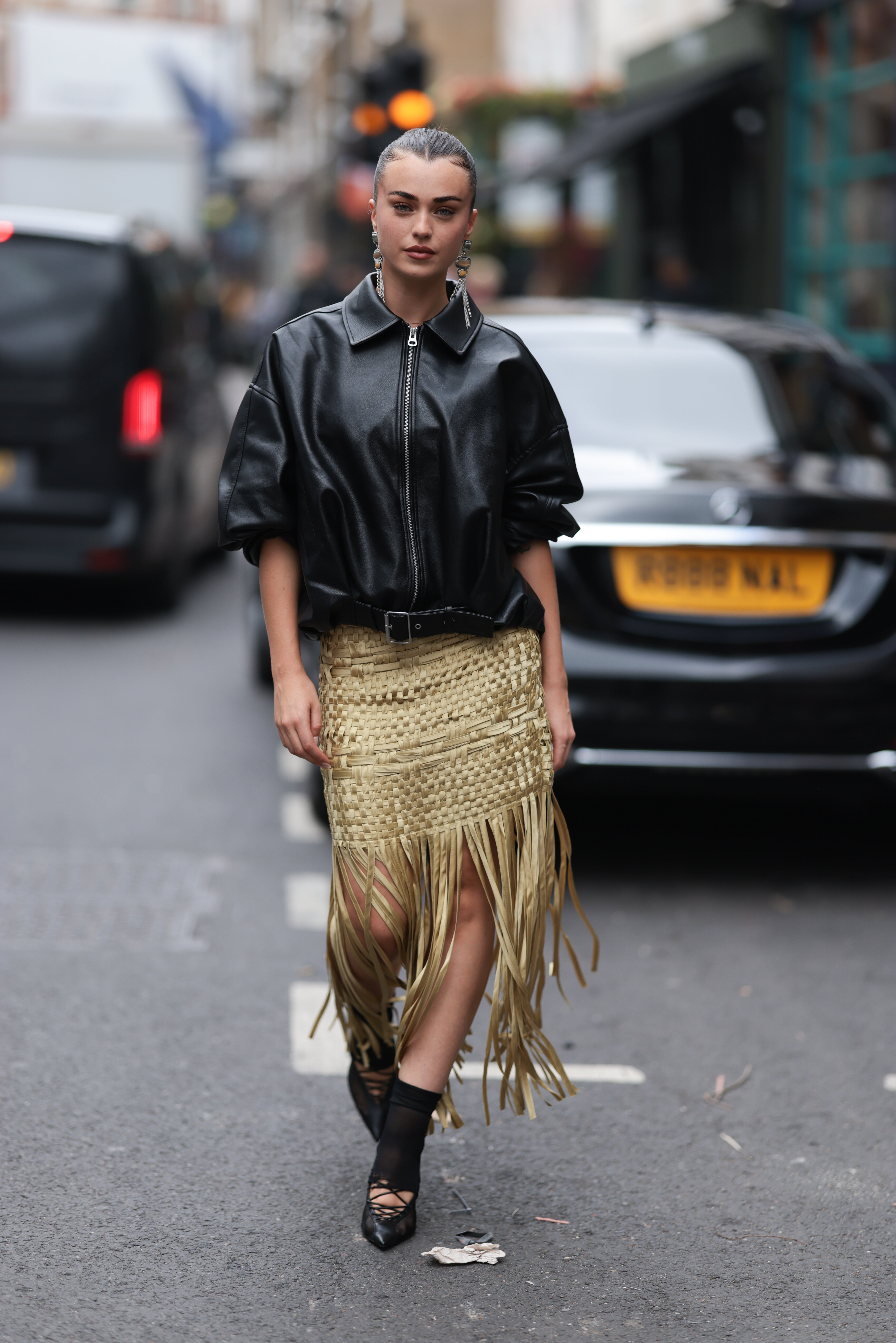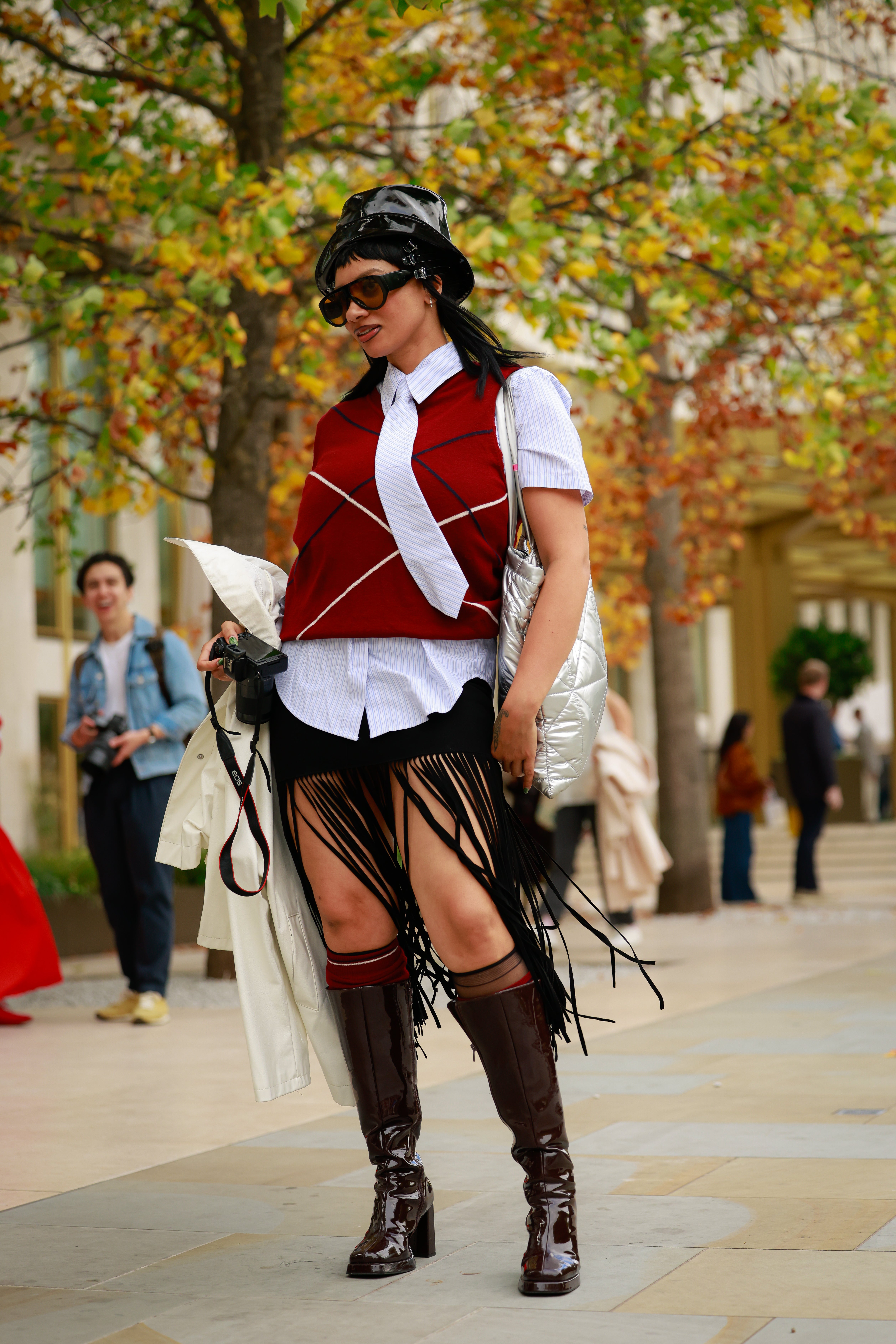 While everyone’s individual style shone, some overarching themes and details stood out. From preppy stripes, plaids, tartans, and argyle to peek-a-boo collars, pleated mini skirts, statement crew socks, and chunky loafers, LFW attendees nailed the back-to-school look (that we adults still love). Many guests also opted for tried-and-true fall ‘fits in rich monochromatic tones (think: browns and burgundies) and leather bomber jackets, as well as spring-coded trends like fringe skirts and colorful tights.