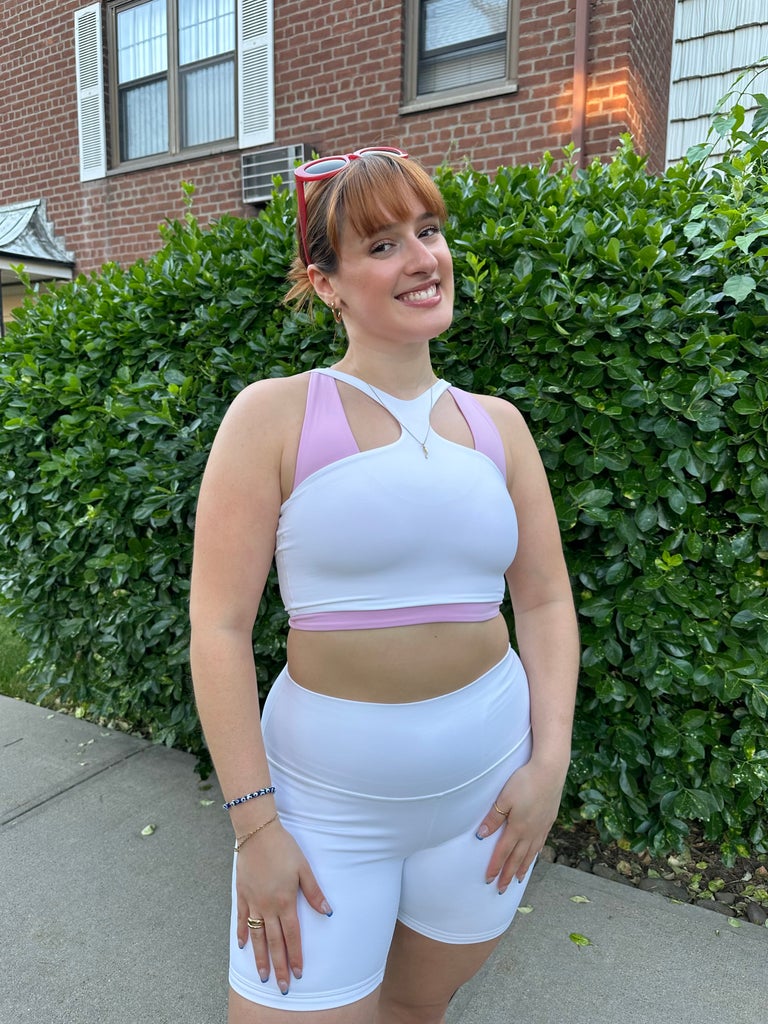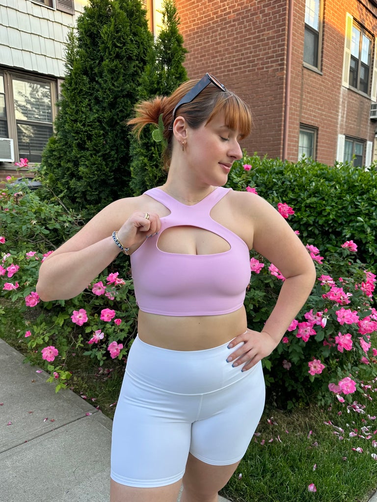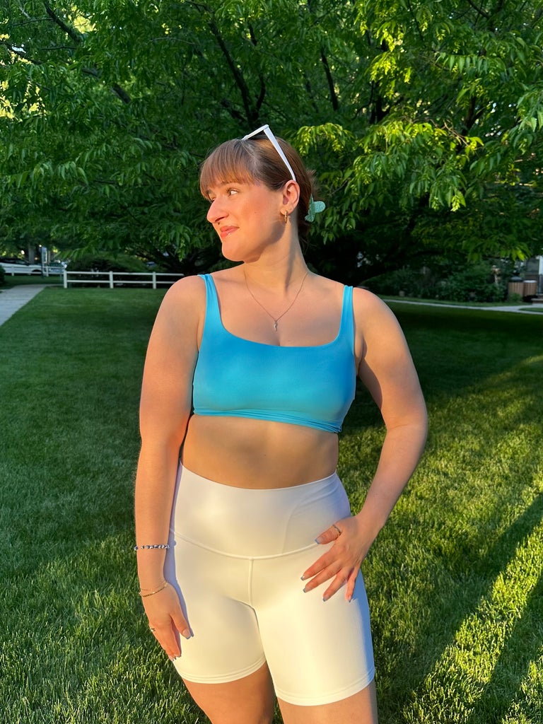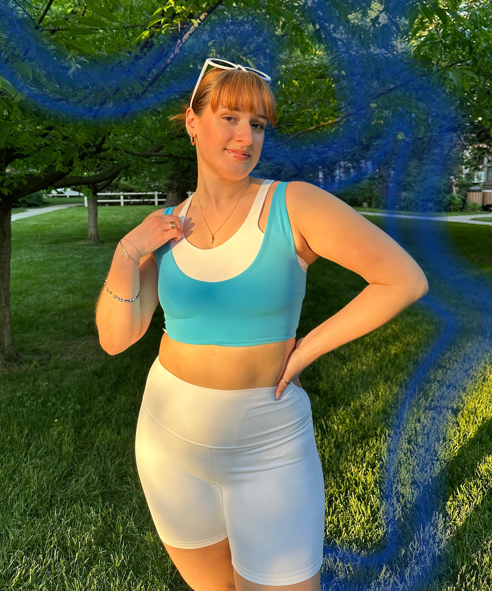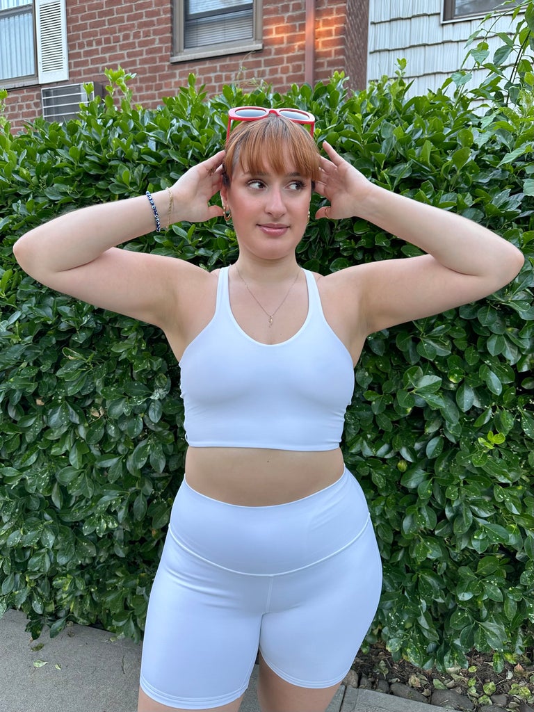 I was the most hesitant about the V and Racer Bra because of the narrower-than-normal neckline and skinny racerback shape. That said, it surprisingly ended up being my favorite layering option; I reached for this style when wearing it over and under the other sports bras. When styled with the white Align shorts, the all-white look gave Milla Jovovich Fifth Element vibes… and I was digging it; when paired with the Scoop and Cross Bra, it offered more coverage and support.