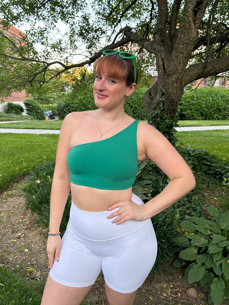 I love a one-shoulder moment, as well as Kelly green, so I immediately carted up the Bend This One-Shoulder Bra because I could also see myself wearing it outside of the gym this summer. I was pleasantly surprised when I saw a bra cup in between the lining that could be removed and hooked to the opposite side when reversed. While the bra cups were visible on lighter-colored bras (more on that below), they provided seamless coverage in this colorway (and likely other darker hues like black).