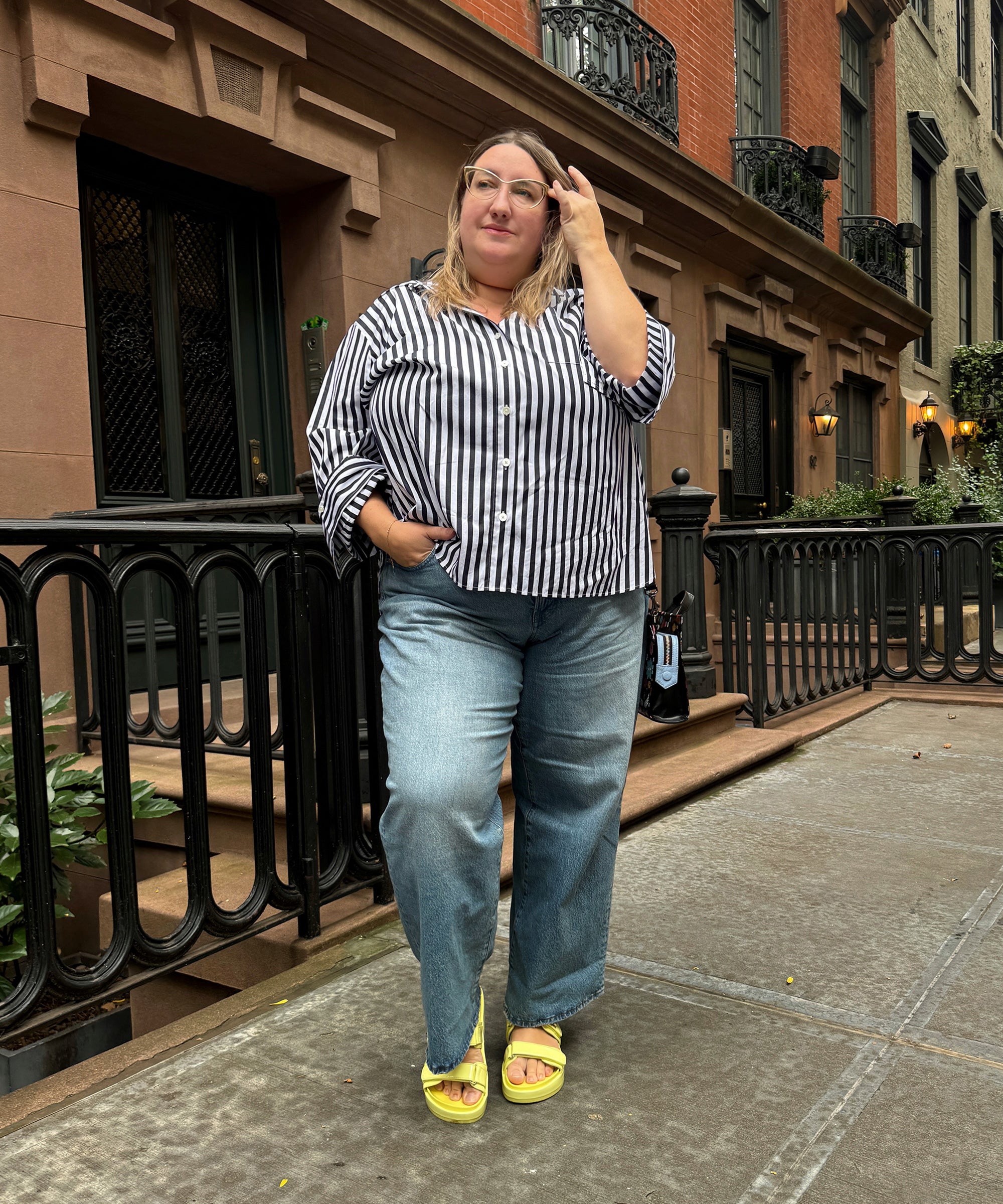 Baggy jeans have had street style in a chokehold for the past year, so I’m constantly on the lookout for cute options available in plus sizes. Somewhat ironically, the fit is particularly important in this looser silhouette — you want the bagginess to look purposeful, not like you’re wearing a pair of jeans in the wrong size. This pair is 100% cotton with no stretch at all, so I tried my usual 20W in Madewell jeans, hoping to strike that sweet spot of baggy but well-fitting.