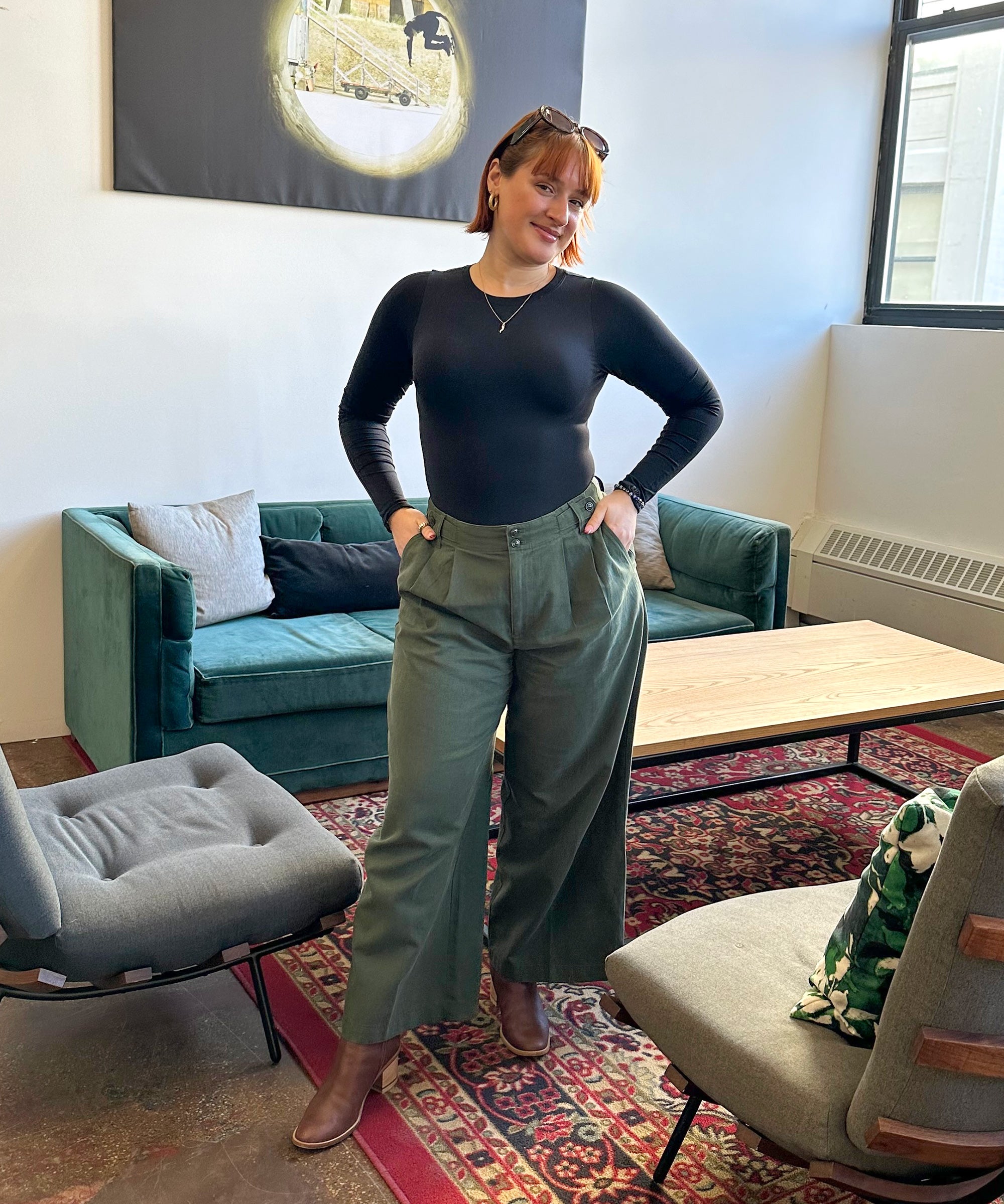 Standing at 5’3”, and currently having a 31-inch waist and 43-inch hips, I opted for the same 10 Petite sizing as my original Harlow pants. But this time, I picked the versatile and cross-seasonal Dark Forest shade. When I finally got to slip into them, they truly fit like a glove. The contoured band perfectly fit and flattered my waist and gave me that cinched look that I love. When I compared them to my OG Harlow pants, there was a clear difference. The regular petite fit has much more wiggle room at the waist and a more oversized look that requires me to wear a belt. Meanwhile, the petite Curvy Harlows look more fitted and better hug my curves while still feeling roomy and comfy. I’ve already worn them to the office and plan on wearing them whenever I need an elevated yet effortless outfit.”—Victoria Montalti, Associate Affiliate Writer