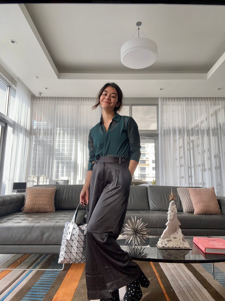 “For daytime, I dressed down the pants with a cropped logo tee and white sneakers; for a date night with my fiancé, I loved going for a classic vibe. I paired the look with a sheer blouse (I wore a tank underneath, but could see myself sporting a lace bralette — or nothing — as well), with the sleeves pushed up in that French-girl way, and platform boots to elongate my legs. I love how these pants aren’t something I’d necessarily reach for first off the rack but, paired with some of my favorite pieces, it manages to feel very ‘me.’”—Karina