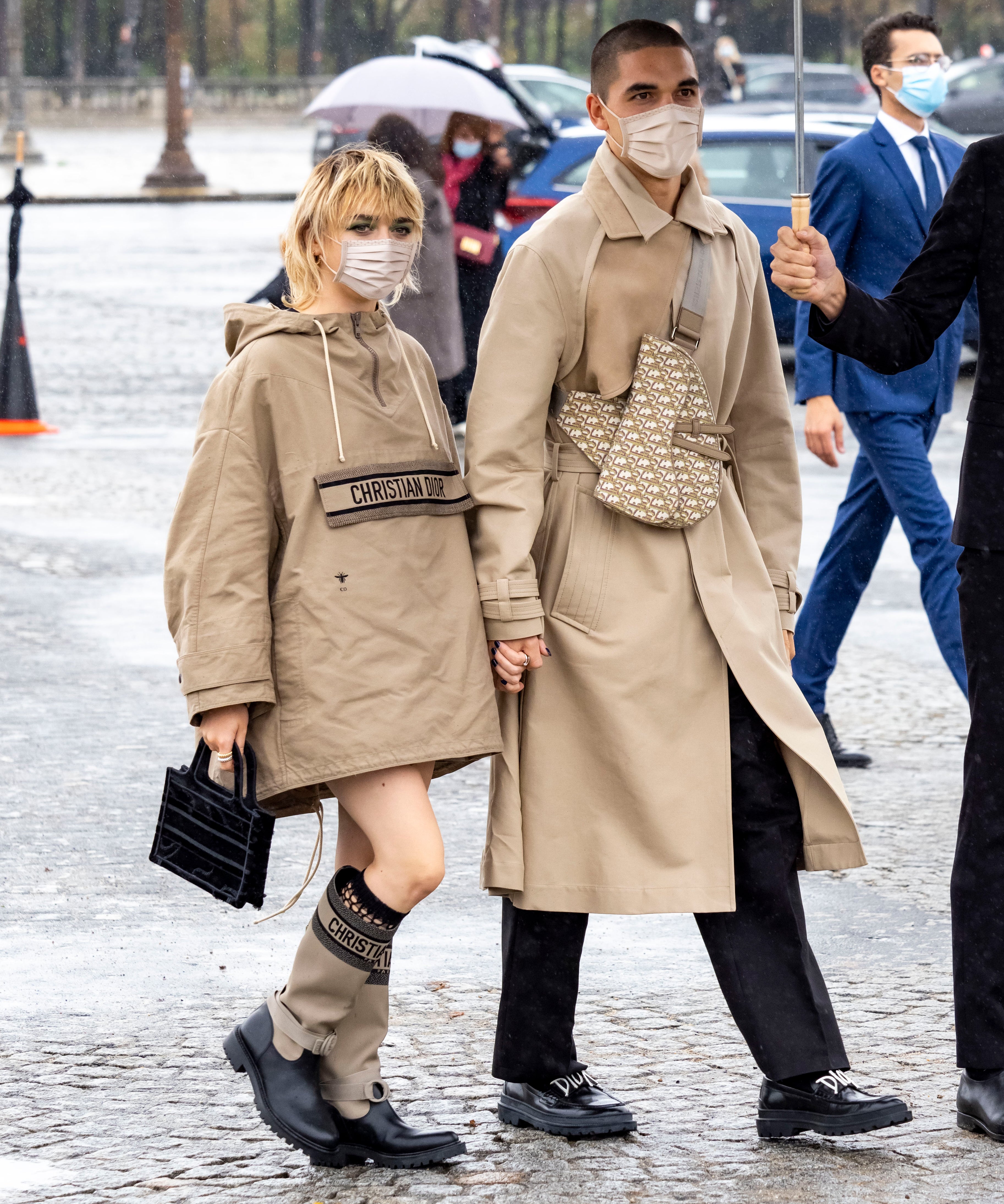 Let’s get one thing straight: We’ll never forget Arya Stark Maisie Williams in her leather armor, needle tucked in her belt. But after appearing in head-to-toe Dior rain gear for the French fashion brand’s show on Tuesday, Williams gave us another standout look to think about for a while. For the fashion show, the Game of Thrones actor, along with her boyfriend, Reuben Selby, chose matching ensembles: Williams wore an oversized khaki anorak as a mini dress with fishnet socks and knee-high rain boots, while Selby paired a structured trench coat with slacks and lug-sole loafers. Both carried Dior handbags, Williams’ a tiny top-handle in black and Selby’s a khaki-and-white Saddle bag which he wore across his body. Even their face masks — which were also khaki-colored — were a perfect match.
