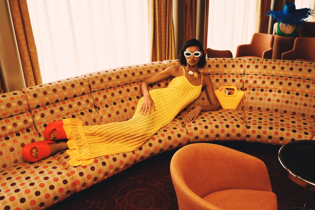 True to the Simon Miller brand, accessories play a central role in the drop, with the label’s ubiquitous platform shoe silhouettes appearing in the form of colorful slides and a sky-high flip-flop heel with an architectural sole. This is rounded out by sun-shaped jewelry, printed bucket hats, and cartoon-like balloon sunglasses, with the latter being a first for the label. “I don’t have sunglasses in my main line, and they are such an important part of the way I personally dress and style. So to test them out with Mango, that was really exciting for me,” says Hansford. “If they’re very successful, [we’ll] probably do them ourselves.”