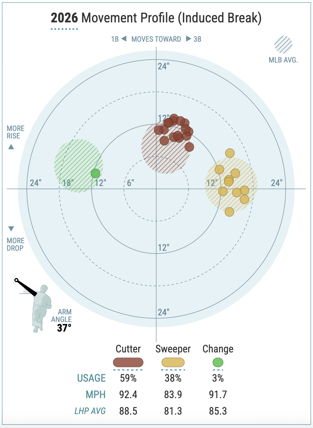 The pitch is intended to give Fluharty something to run off a right-handed hitter’s bat. Getting whiffs down-and-in from lefties wasn’t Priority A. But that’s become an option as Fluharty’s continued to hone the pitch, particularly against batters who have seen him frequently. If they start cheating out to pitches away from them, Fluharty can now work those lefties back inside.