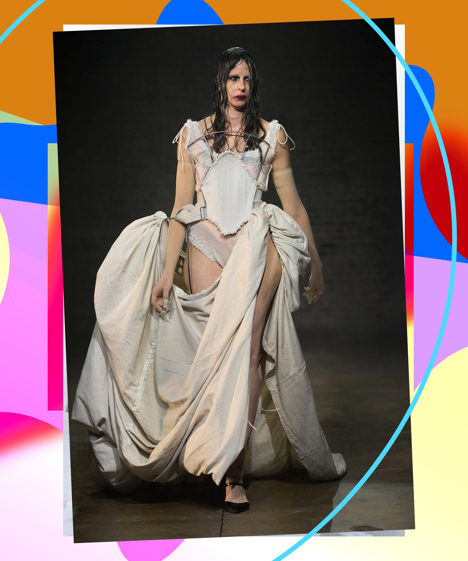 Back in September, when designer Elena Velez held her second ever fashion show during New York Fashion Week, Uncut Gems actress-turned-It-girl Julia Fox was sitting front row. Holding her toddler son on her lap, Fox, who was personally invited by Velez, was decked out in the designer’s notoriously apocalyptic garments: a draped, leather black dress that resembled Hefty trash bags and thigh-high boots, embodying the vision of a complex woman who is both rebellious and matriarchal.