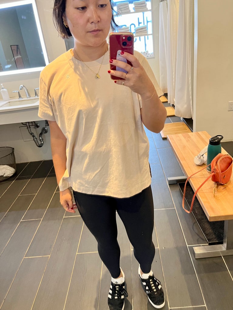 I took these leggings out (which fit true to size) — and I wore a whole DK Active set to match with a medium-support bra called the Ignite Crop (which fits true to size) and a 100% organic cotton Side Swipe Tee (which fits like it’s sized up) — for a double-whammy workout of a high-cardio tennis match in 85-degree heat, immediately followed by a lower-impact indoor barre class. The leggings, which wore like a second pair of skin the whole time, were compressive and kept everything tucked in throughout without any uncomfortable squeezing of my gut. Joy joy joy.