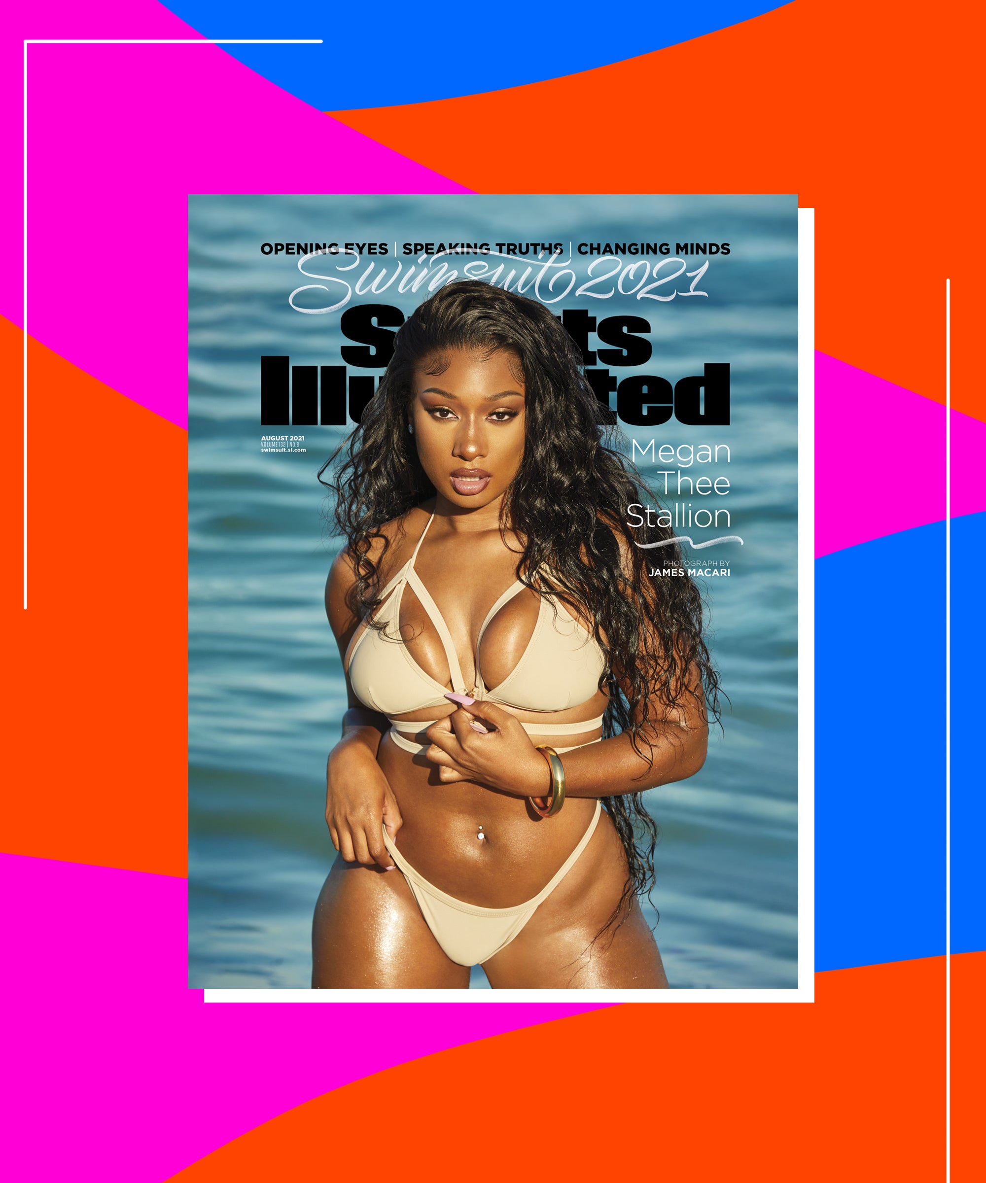 Being the daring dresser she is, Megan Thee Stallion modeled the bare-all swimwear trend that’s been making waves all season long. For her cover shoot, the “Savage” singer — who is the first female rapper to grace the cover of the publication’s swimsuit issue, which started in 1964 — donned a sand-colored strappy bikini by Fashion Nova which featured under- and over-boob cut-outs. (The rapper has her own line with the fast-fashion brand.) And that wasn’t even the only peek-a-boo moment from the shoot.