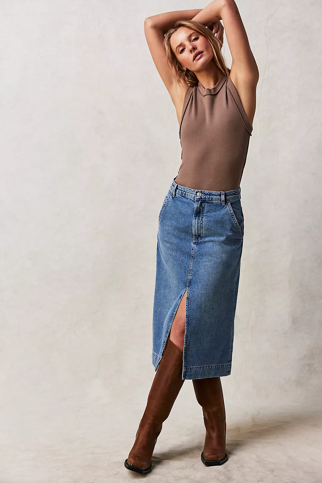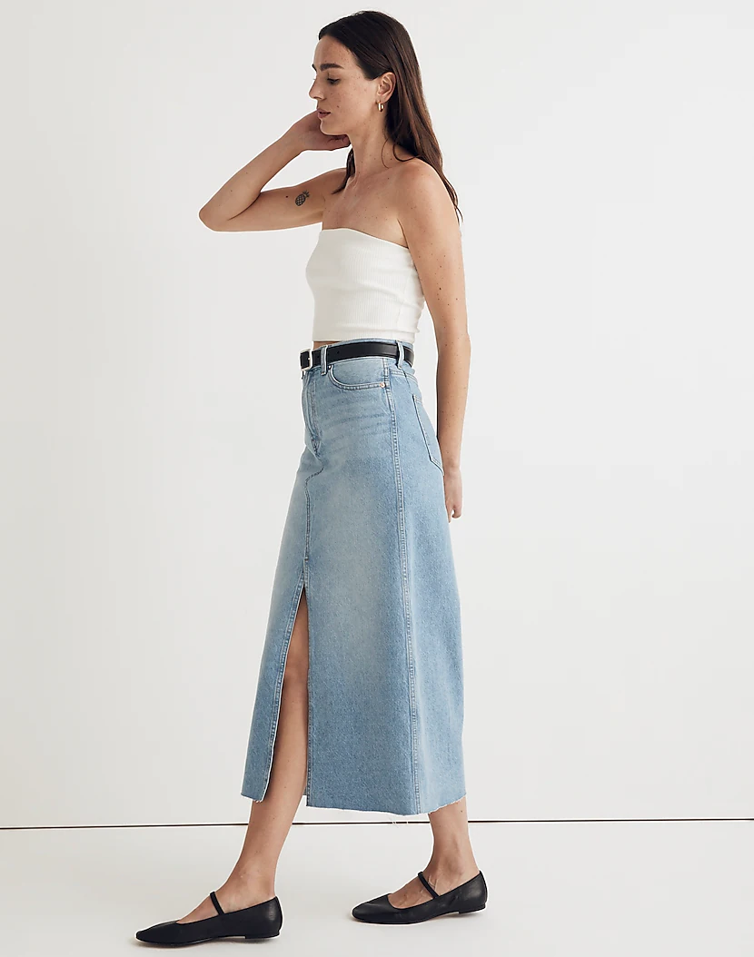 Denim midi skirts are an offset of the wildly popular and nostalgic denim maxi skirt comeback. Again, a midi-length option is perfect for the day (and situationally the night) and is a bit more wearable than a maxi style. Each of these denim midi skirts also feature front slits for walking ease and some much-appreciated breeze.