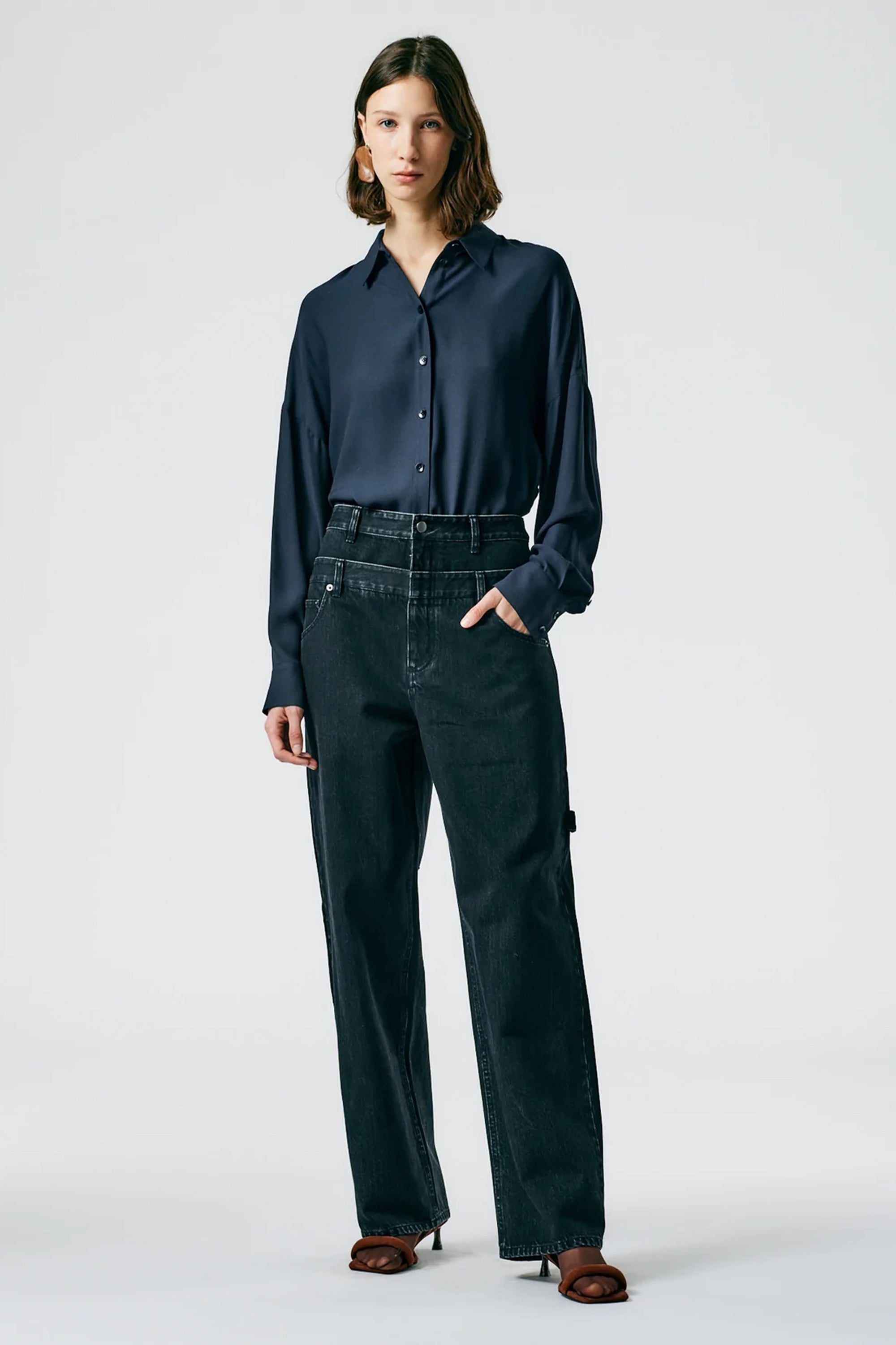 Can’t quite picture it? Let’s break it down. The double-waisted jean consists of a second waistband that sits higher than the exterior fabric, making it look like a person may have two pairs of jeans on. So far, brands like Tibi, Monse, Sandro, and River Island have tackled the trend, each with a unique take: Tibi released a wide-leg version in a dark wash, as well as a midi skirt; Sandro dropped a two-tone pair with contrasting washes; and River Island’s version includes contrasting shades on both the waist layers and the legs. “I wanted something that sat higher, that hugged me — almost like a corset would, but with a sense of ease,” says Tibi designer Amy Smilovic.