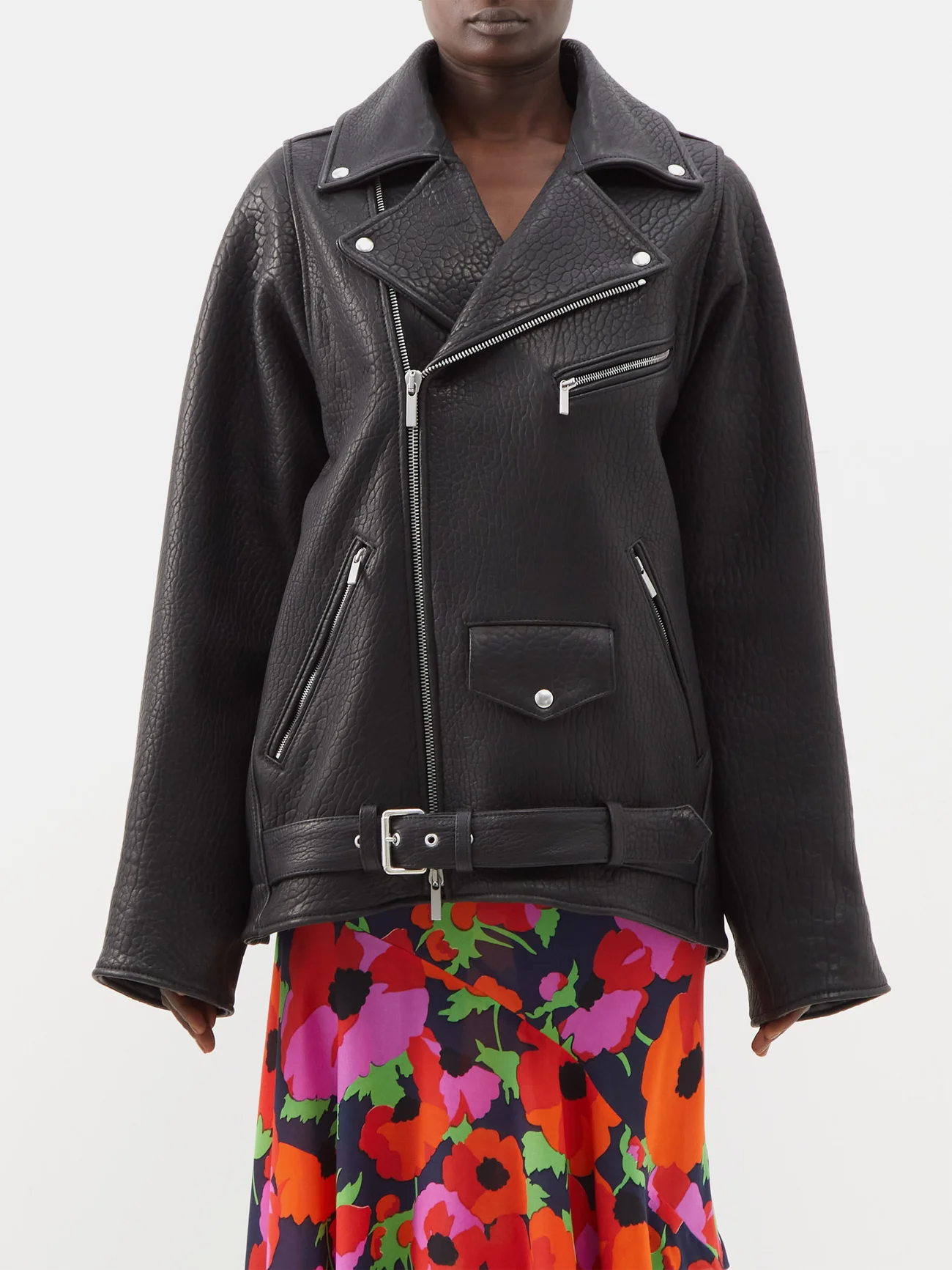 Raey Curved Pocket Tumbled-Leather Biker Jacket, $, available at Matches