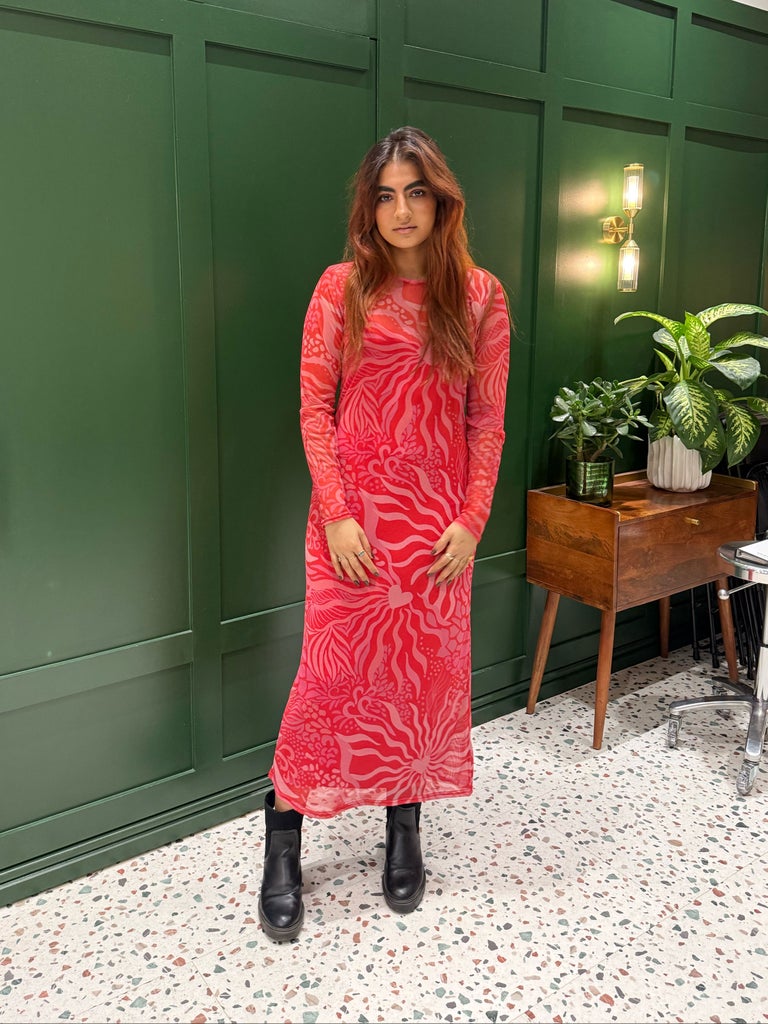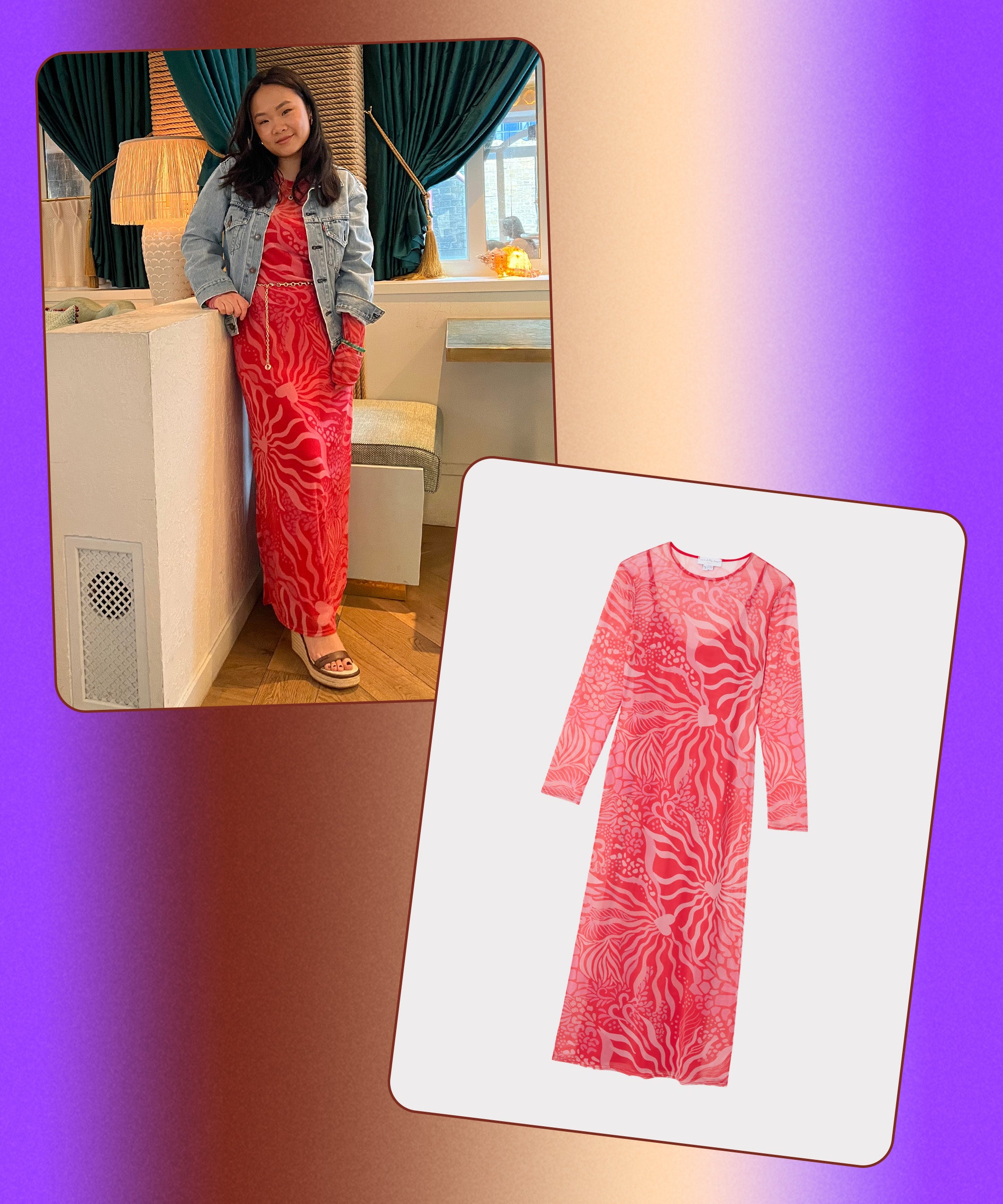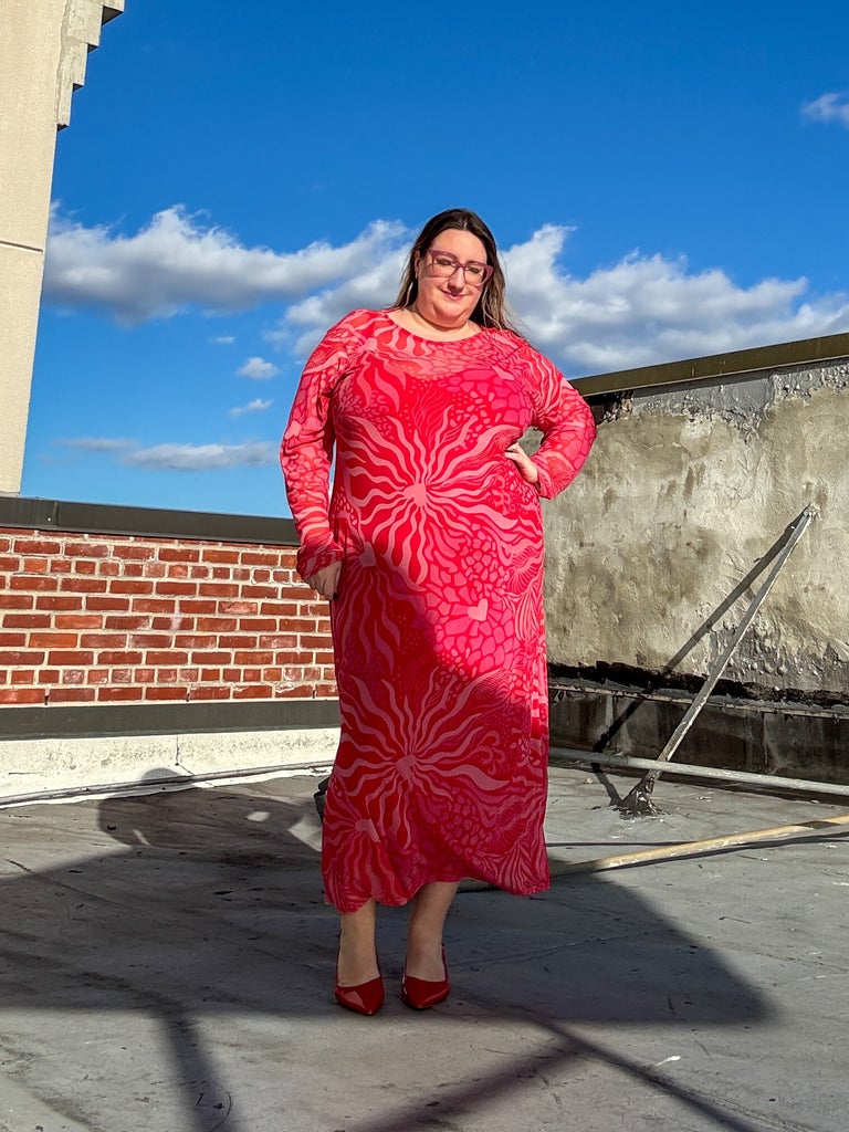 We’ve heard whispers of the mesh maxi dresses (available in sizes 2 through 24) from UK brand Never Fully Dressed (a reader favorite for wedding guest styles) that have seen many versions from a sunset ombre to a Mediterranean landscape. Eager to see how the sheer statement dress fit on different body types, we took its newest iteration — a pink and red animal-meets-heart print that’s perfect for Valentine’s Day — out for a spin.