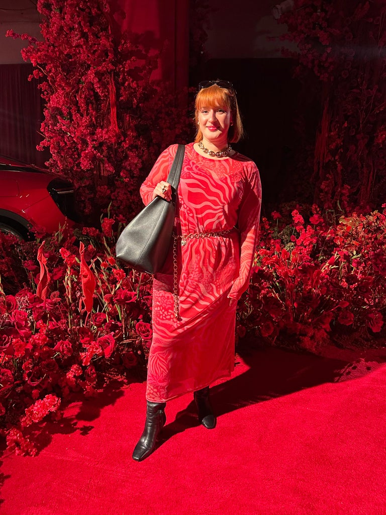 “After seeing photos of models wearing this sheer dress with black undergarments, I knew I wanted to try to replicate the bold look (before realizing there was a detachable red slip dress underneath). I initially styled it with a lacy bra and boyshorts — which was so cute and, surprisingly, made me feel so confident — to wear to NYFW, but couldn’t bring myself to do it in the frigid February weather. Instead, I slipped on the slip underneath (which provided much more warmth), a gold chain belt on top (complete with a heart charm that complemented the heart pattern), plus a black puffer coat, oversized shoulder bag, and knee-high boots to make it a bit more weather-appropriate. And it was a hit!