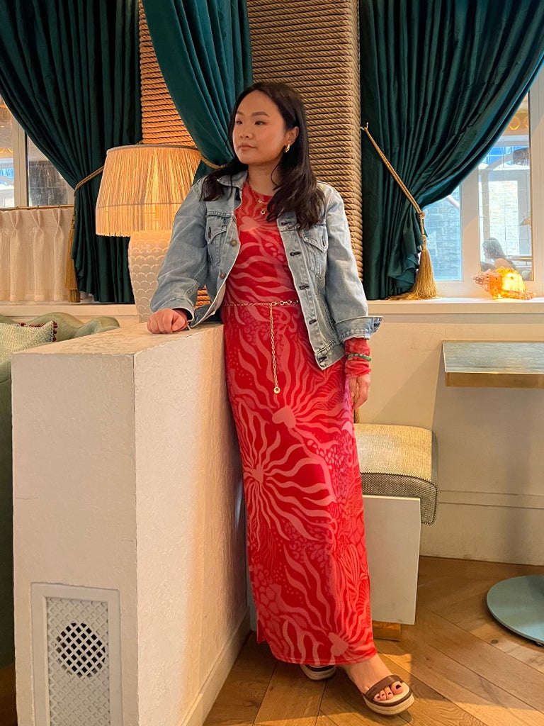 The punchy color and Y2K-inspired print gave me some serious Lizzie McGuire nostalgia, so I styled the dress with a light denim jacket, topped off with some snazzy accessories, including a gold chain belt and my grandma’s jade bracelet.