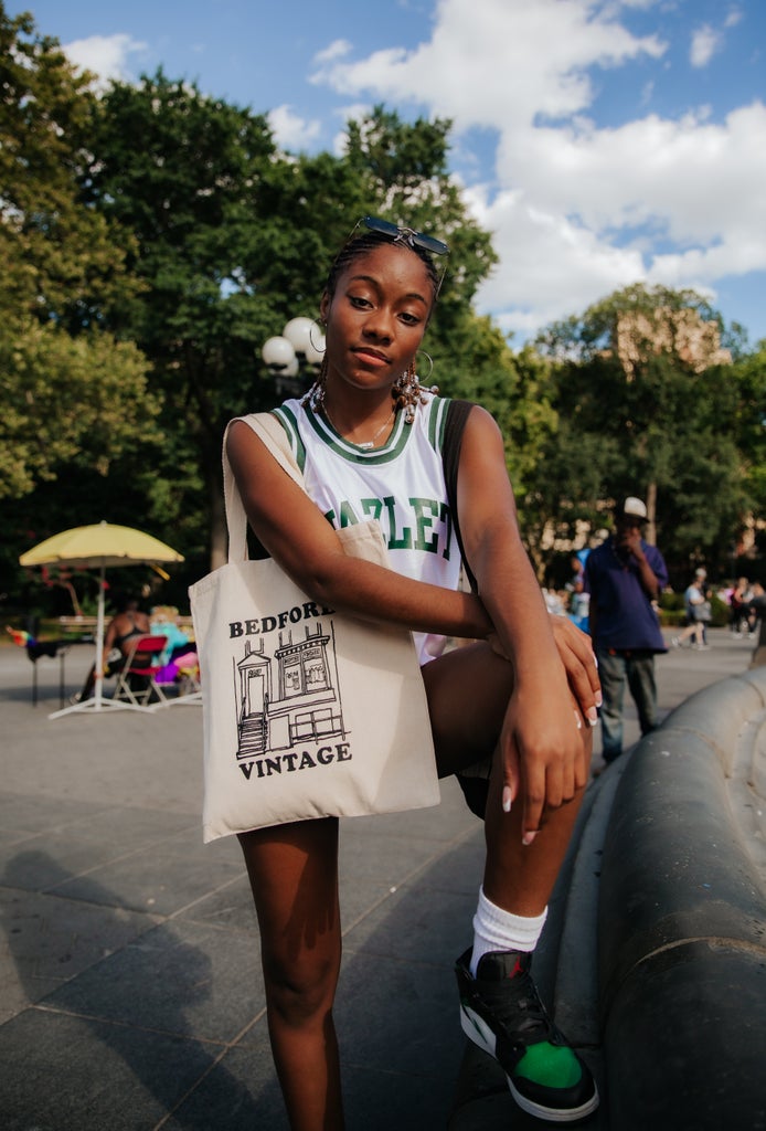 What I’m wearing: I’m obsessed with [matching]this thrifted top with these pants because, even though the fabrics are really different, they mesh really well together. These beautiful parachute pants were actually made by my boyfriend. I’m wearing [Aimé Leon Dore x New Balance] 550s and then a vintage Coach bag.”
