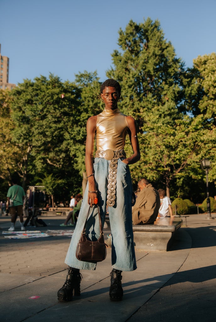 What I’m wearing: “A shirt that I made myself. I got this bag from a thrift store in the Bronx. I got the belt from a beauty supply [store,] and these jeans from a discount place for like $5. My shoes are Demonias.”