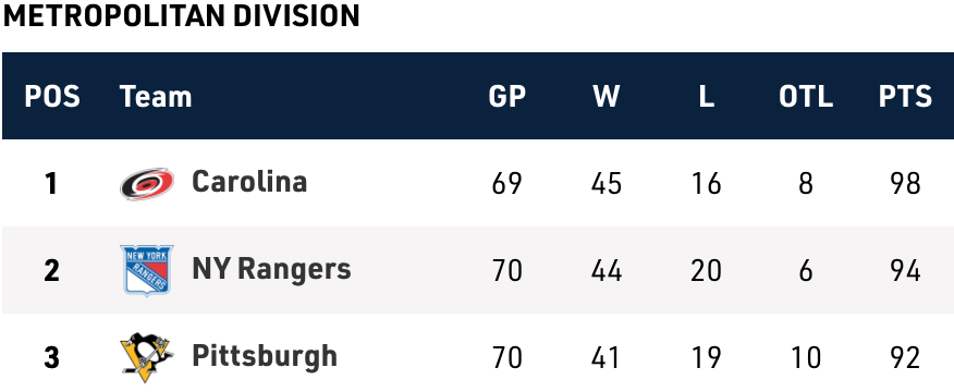 There is still some sorting to do within the Metro Division’s top three, but with Carolina holding a four-point lead and a game in hand, it does look most likely that the Penguins and Rangers will meet in the first round. If so, we’re getting a preview on Thursday night.
