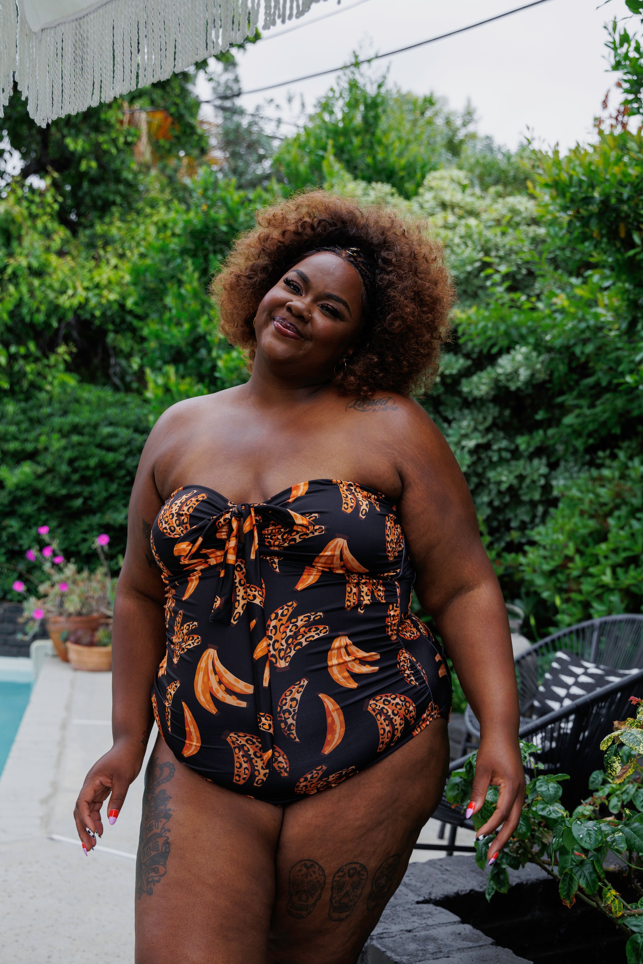 With cheeky banana and parrot prints, along with a cool textured palm motif in black, and swim styles ranging from deep plunge bikinis to cut-out one-pieces, the collaboration has something for everyone. And Kitty and Vibe’s new extended size range makes it more inclusive than ever, with the Nicole Byer collection available in sizes xs to 6x (the brand previously went up to 3x).