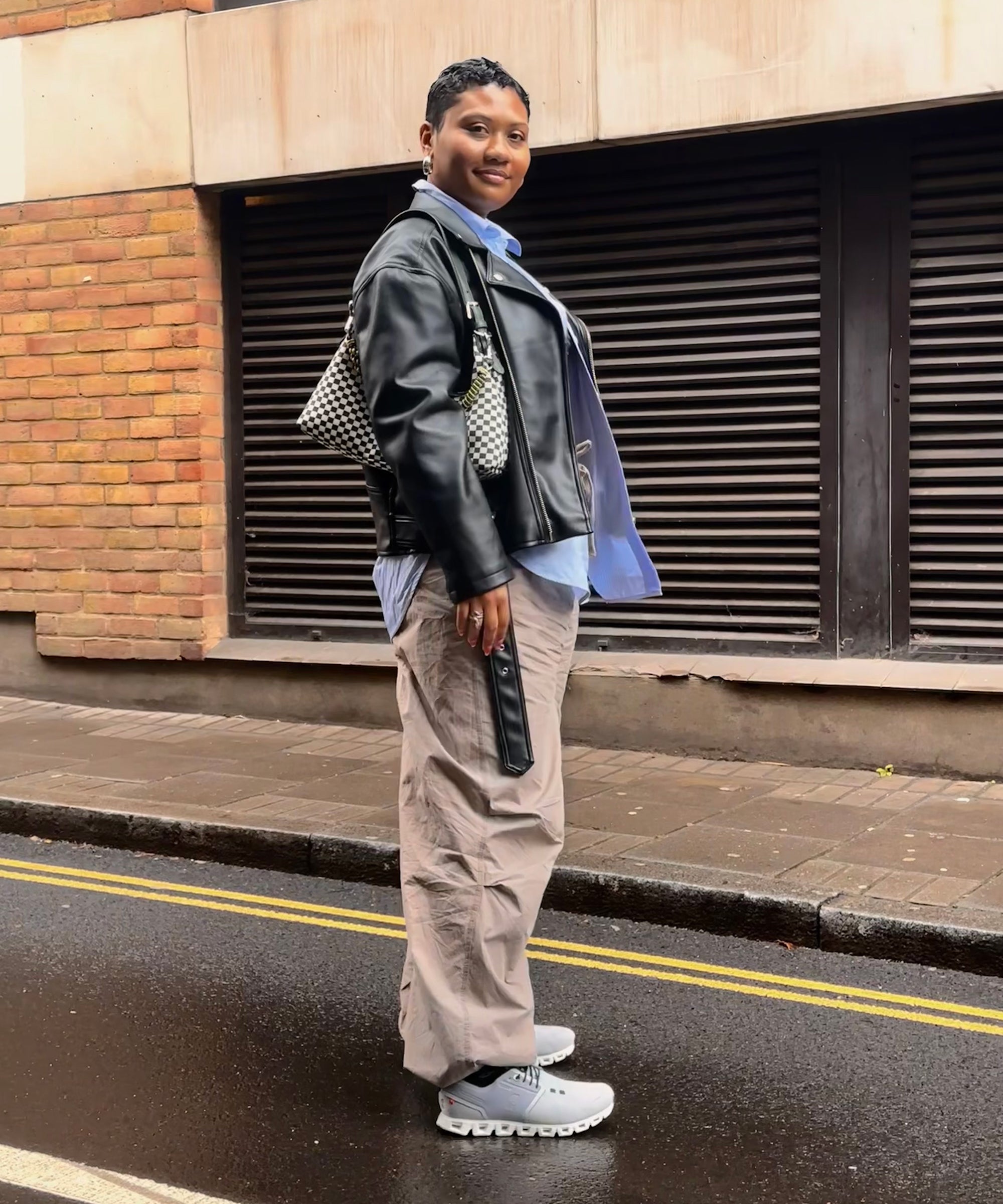 The first pair I test-drove was the Cloud 5 Waterproof in a light grey-and-white colorway. I normally wouldn’t choose sneakers in this hue, but after seeing gray all over the runways, I decided to test its styling potential with my go-to casual trousers: parachute pants. As these bottoms are practically made for gorpcore girlies, this outfit came together really naturally. I styled them with an oversized shirt and leather motorcycle jacket on a rainy day, and felt both cool and untouchable. Puddles? NBD.