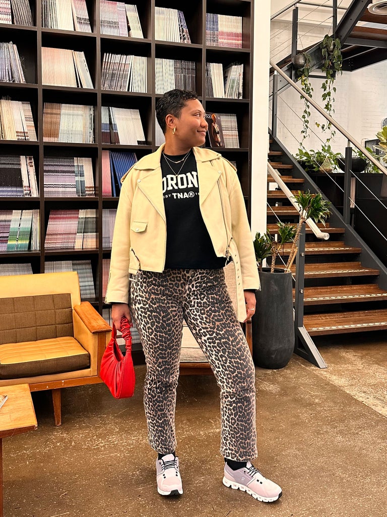 Next, with the same Cloud 5s, I went for a bolder look with leopard print jeans, a crew neck sweater, a motorcycle jacket, and a red handbag (I love how designers favored red accessories during the most recent fashion month, so this was a perfect opportunity to flex mine). As this was my first attempt at dressing up On running shoes, I realized it would require more thought than it would to dress up my other sneakers. In the end, I was satisfied with the final look, which I’d describe as “city girl on the go.”