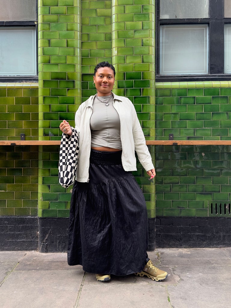 The second pair I tried was the Cloudwander Waterproof, On’s multifunctional hiking shoe, in a military green. These feel more similar to Salomons because of their chunkiness and tonal colorway, as well as their versatility with dresses and skirts. Here, I styled it with a maxi skirt, a tee, and a vintage overshirt, adding chunky silver jewellery for extra playfulness. Have I mentioned that I love the waterproof feature? The showers were no threat to my comfort in this fit.