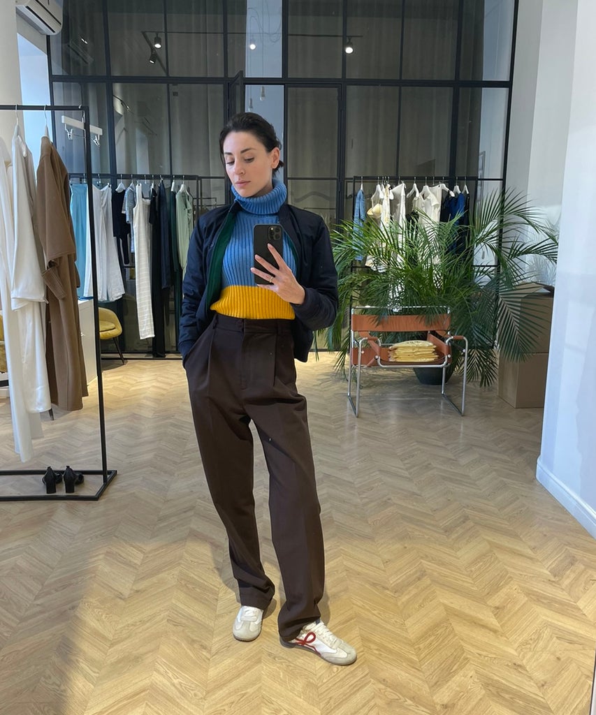 Many of October’s employees left Kyiv also, moving to Western Ukraine or other countries, including Estonia, where the brand has an office. But she has been able to keep producing her collections in Ukraine, where she has worked with a community of women who have hand-knit some of her pieces for close to a decade. “We have always had a community,” she says. “And we luckily can keep it this way, so our customers will feel the warmth of their hands while wearing our knits.”