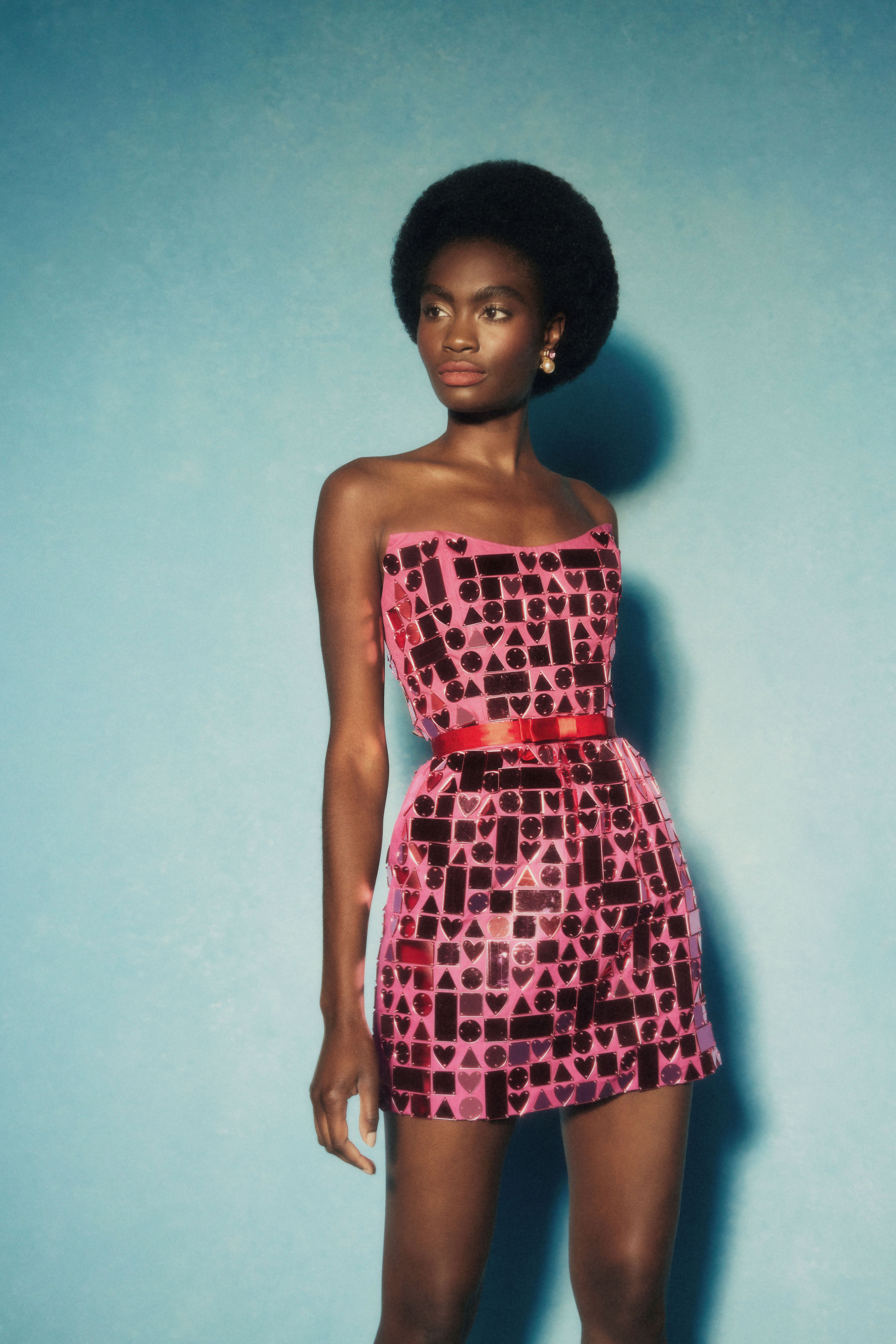 Even ladylike runway names like Jonathan Simkhai, Moschino, and Markarian are also incorporating the party spirit into their Resort 2023 collections, adding disc-shaped paillettes and mirrored spangles into the mix. Meanwhile, Khaite NY showed an assortment of blacked-out sunglasses paired with slinky slip dresses, shearling outerwear, and studded leather, offering up an edgy, rave-ready alternative if sparkles aren’t necessarily your thing.