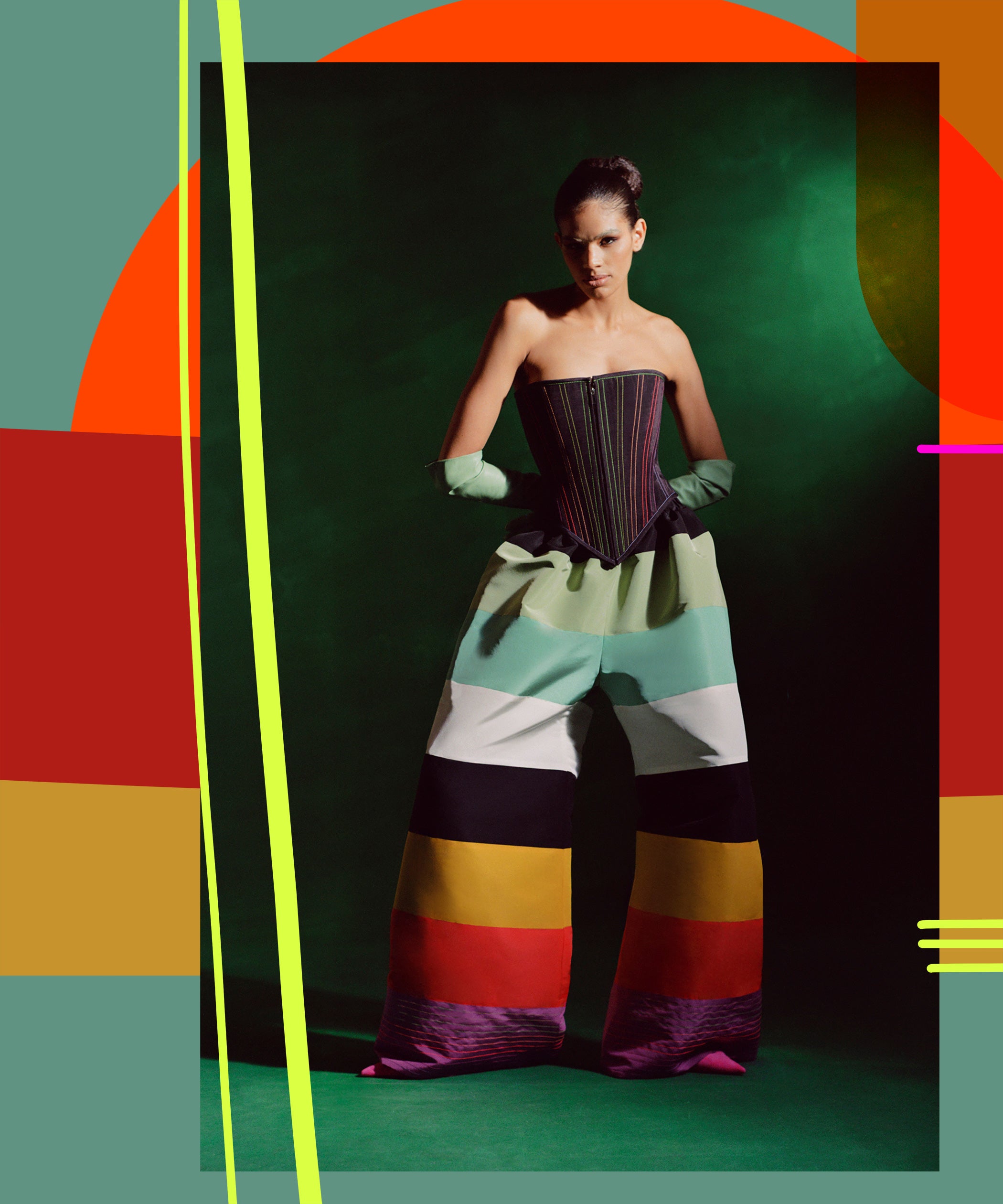 In his signature style, Rogers used vibrant colors. This time around, though, he steered clear of primary colors, selecting, instead, secondary shades, as well as neutrals. The result is Regencycore gowns, featuring petticoat waists and corsets, and suits printed with eye-catching patterns. Playing into the recent surge in demand for party dresses, Rogers used sequins big and small to create frocks perfect for festivities. Crystals, too, made their way into the collection in the form of buttons on an ‘80s-inspired, hourglass-shaped skirt suit with a deep-V neckline.