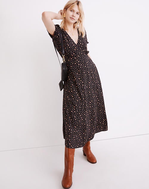 Madewell Puff-Sleeve Faux-Wrap Midi Dress in Stem Scatter, $, available at Madewell