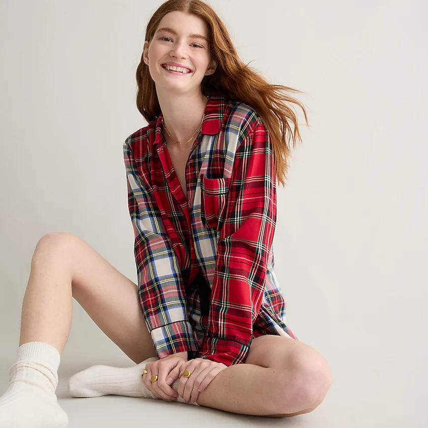 J.Crew Long-sleeve flannel pajama short set in cocktail plaid, $, available at J.Crew