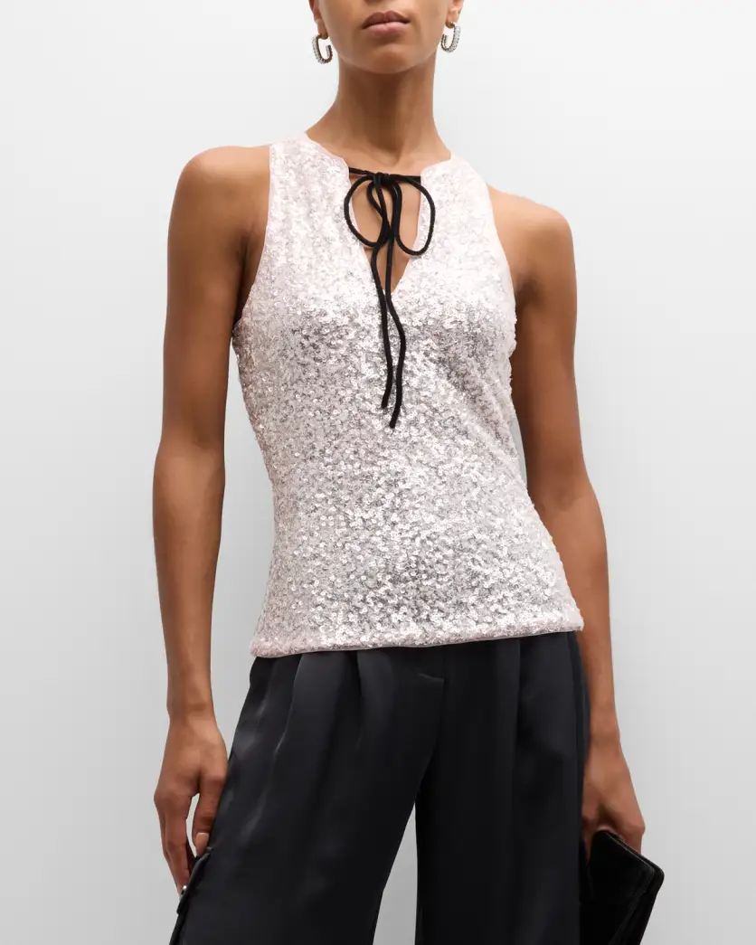 Highly embellished paillettes make this Ganni sleeveless top a statement piece if ever there was one. (It also begs the question, why go to a disco when you can be the disco?)