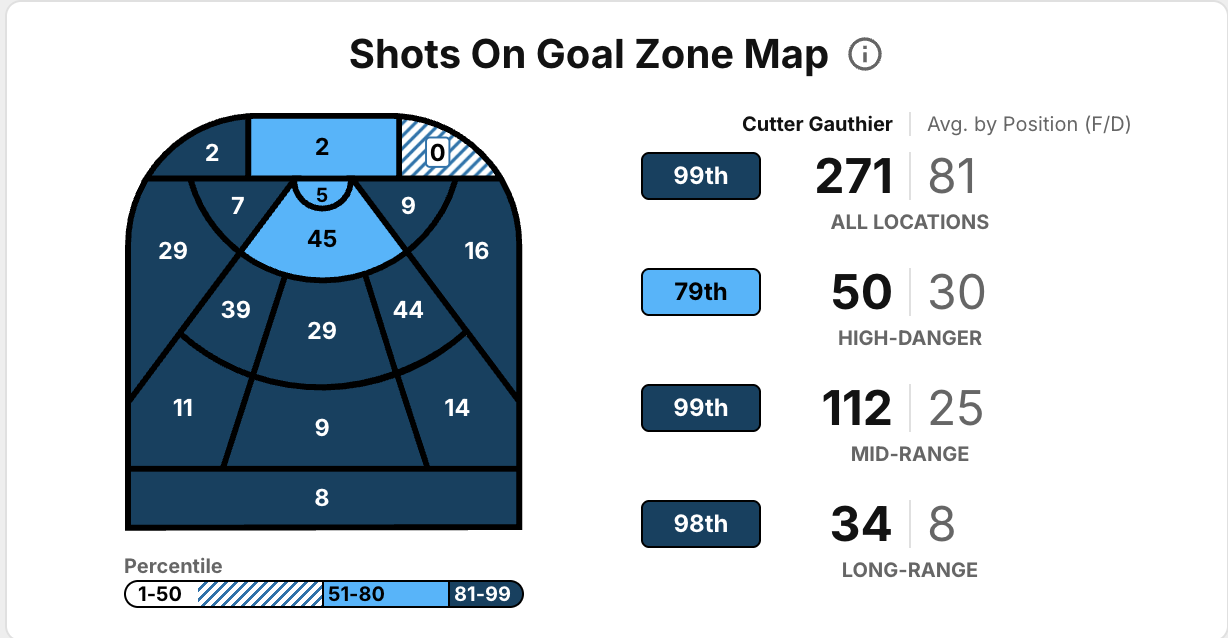 10. The laser disguised as 22-year-old Cutter Gauthier’s shot is in the 99th percentile for both the NHL’s hardest (99.9 m.p.h.) and most frequent (271) this season.