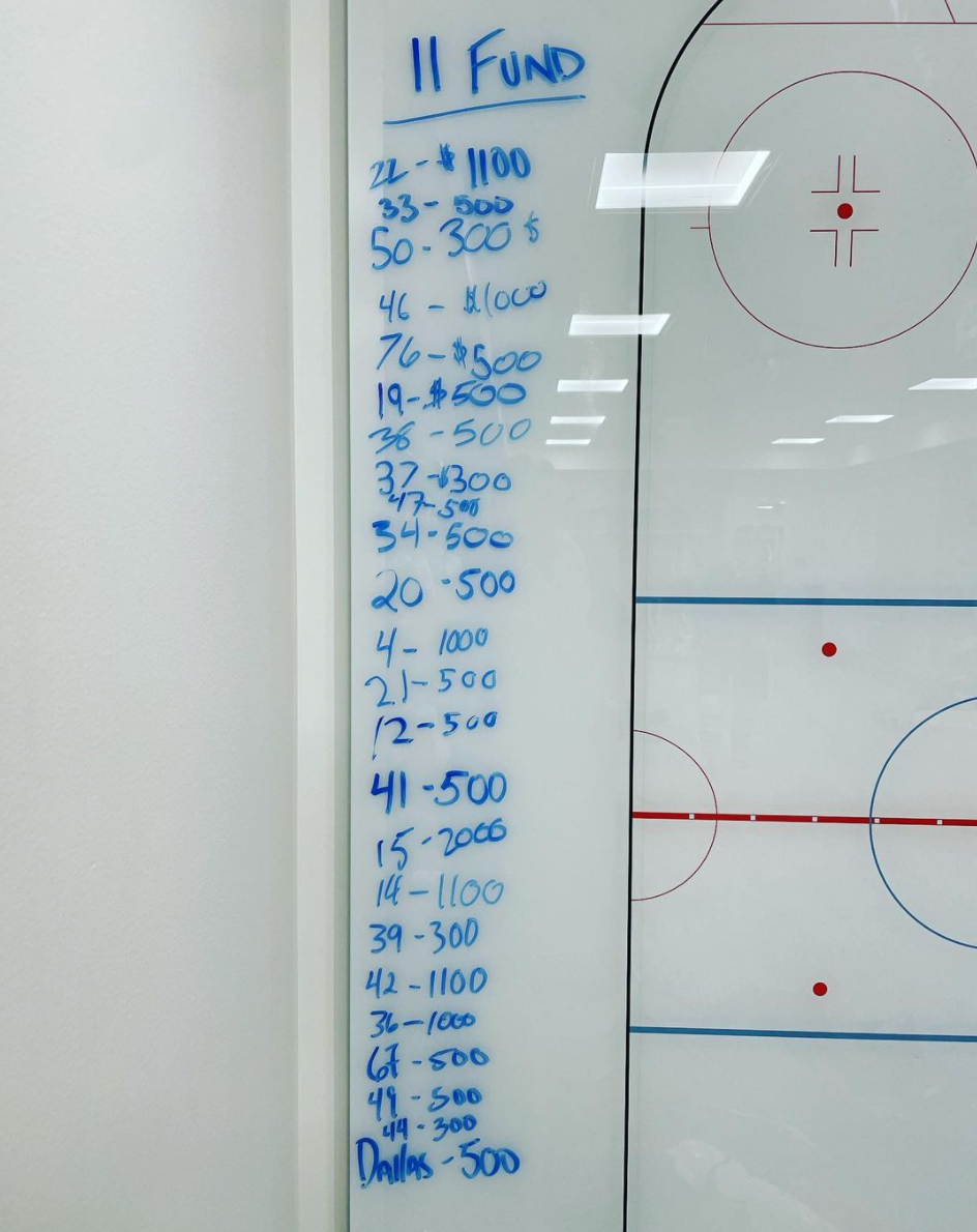 11. Love this money-on-the-board initiative Thursday by Kevin Shattenkirk and the Anaheim Ducks, who kicked in $17,000 for The 11 Fund on behalf of Jimmy Hayes.